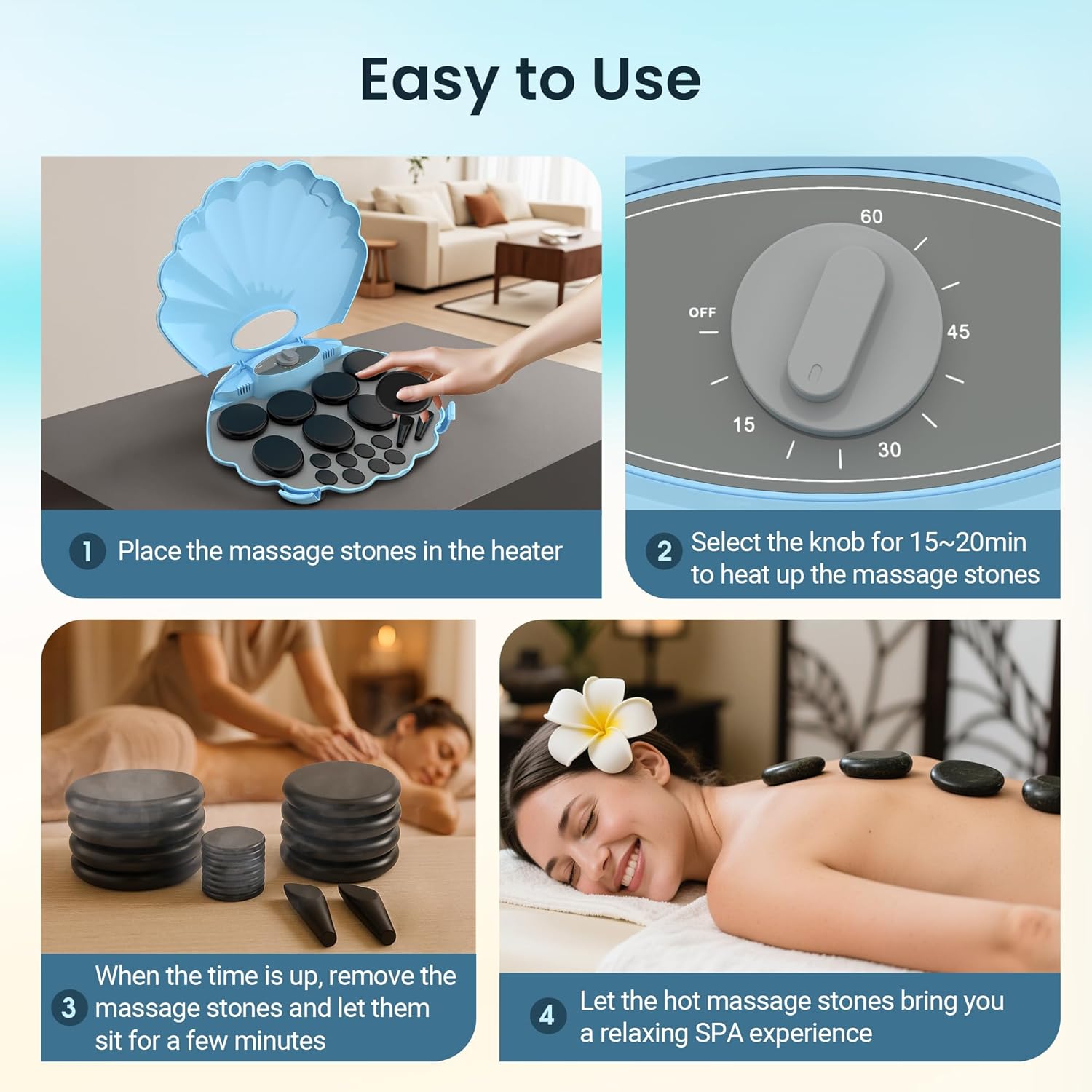 Shell Hot Stones Massage Set, 18-Piece Basalt Hot Stones with Heater Kit, Featuring an Elegant Seashell Design for Spa Use. Perfect for Relaxation, Healing, and Pain Relief. (Blue)