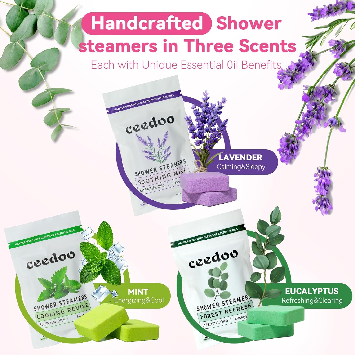 - 3 Signature Scents: Each gift box includes a variety of shower steamers in different essential oil-infused scents, allowing you to choose your favorite aroma: eucalyptus, peppermint, or lavender. Each aromatherapy shower tablet offers a unique sensory experience, wrapping you in nature’s calming embrace.