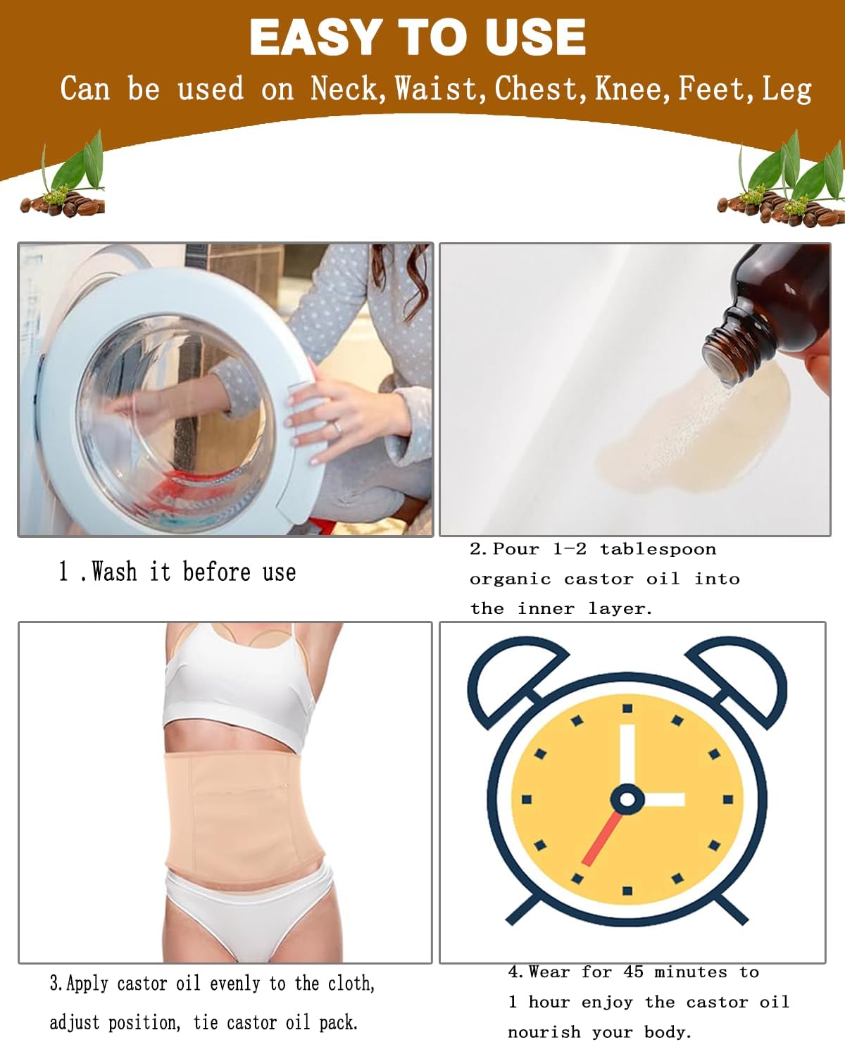 - ✅【9 Pcs Castor Oil Pack Wrap Kit】:FHJBJA Castor oil pack kit contain 1 castor oil wrap for neck, 1 castor oil pack for waist, 2 castor oil packs for chest, 2 castor oil wraps for knee, 1 castor oil pack for back/leg and 2 castor oil packs for feet. Castor oil pack can also be used on thighs, calves, arm joints, ankles, soles, etc. Castor oil pack kit is a complete combination for entire body, provide a full range of care for your whole body(Castor oil sold separately).