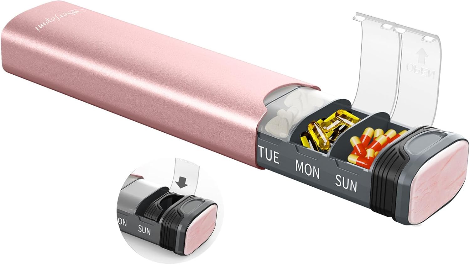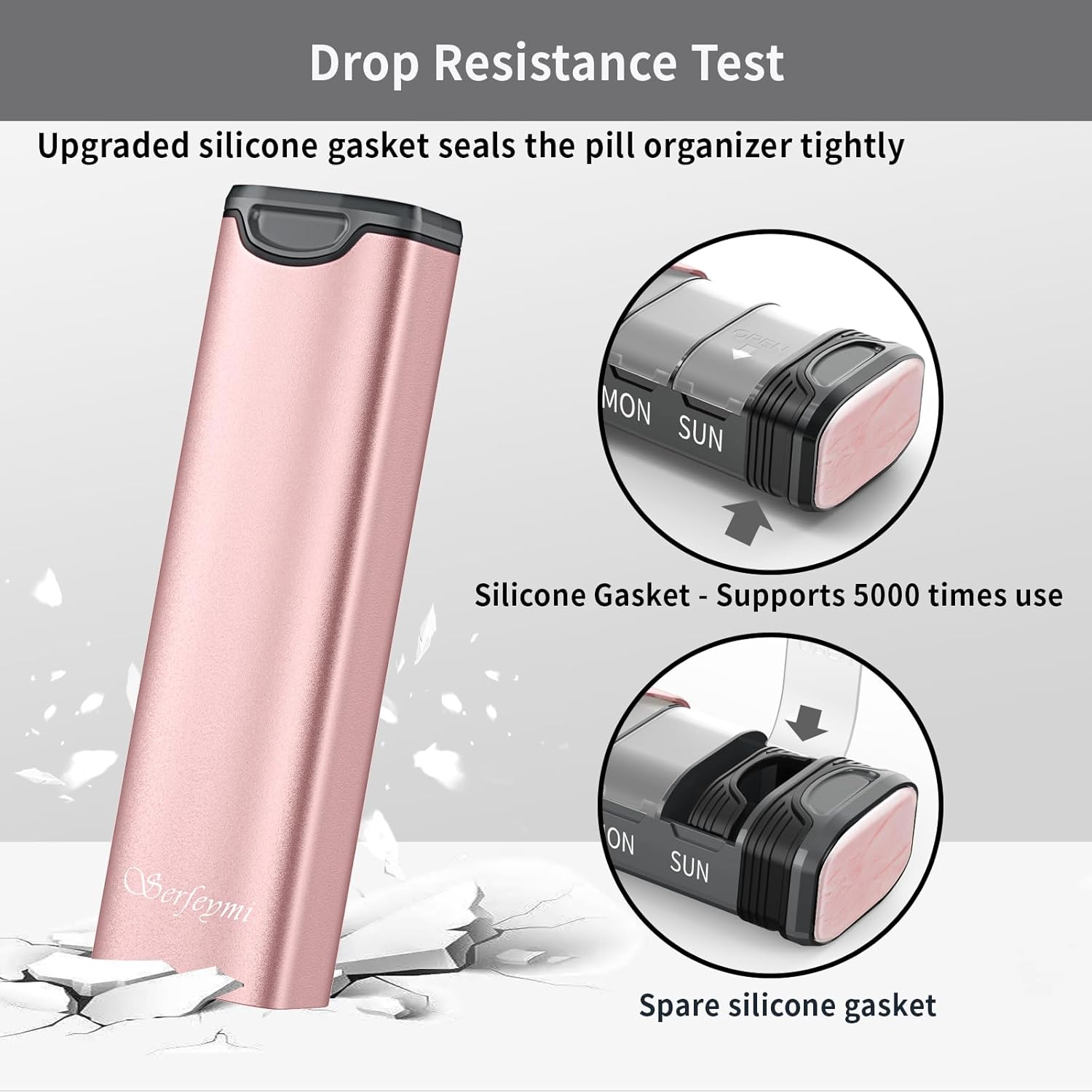 - NO MORE POPPING OPEN BY ACCIDENTALLY - Stop using tape or rubber band to seal trational pill boxes. This product is a slide in/out design pill organizer. It uses a silicone gasket to seal the pill case.Don't worry about if it will get loose after several months. The gasket supports 5000 times use and a spare gasket provided for free. No more risk of popping open. No mess of pills in your bags
