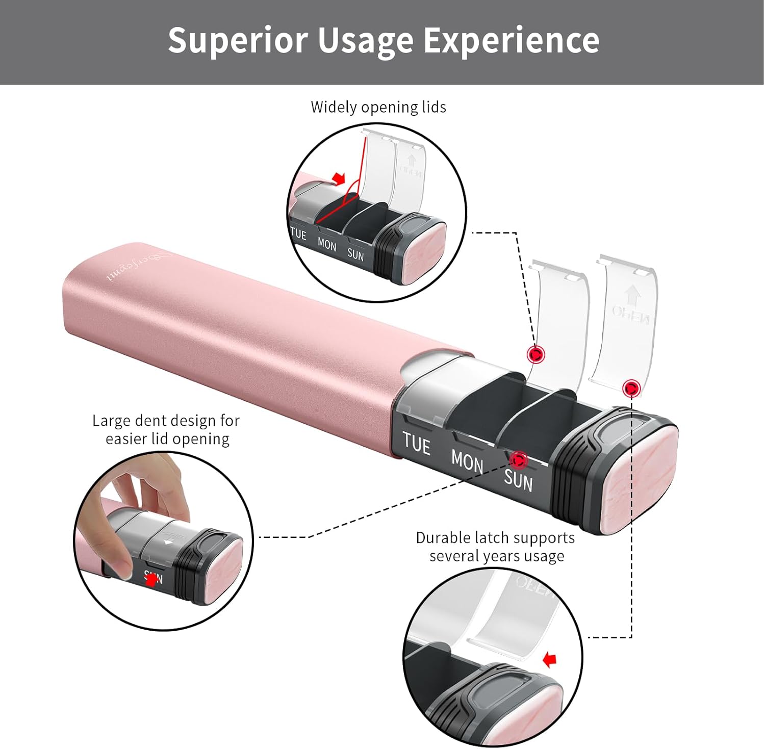 - UPGRADED INDIVIDUAL LIDS- Unlike the lids of most pill boxes on the market that use plastic hinges (which can cause the lid to detach due to plastic fatigue), our design employs a latch mechanism that ensures the lid remains securely in place for years without detaching. Thanks to the ergonomic design, the lid's optimal tension ensures ease of use without excessive tightness, making it arthritis-friendly for effortless access
