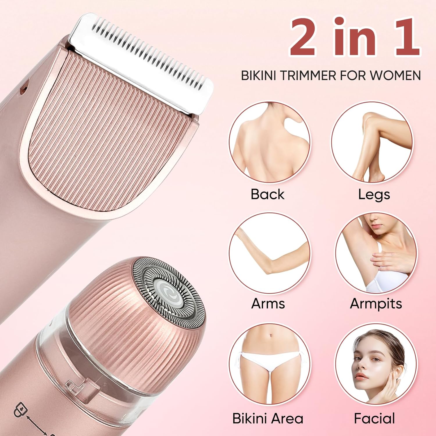 2 in 1 Women Electric Shaver Dual Head Bikini Trimmer for Women IPX7 Waterproof Wet & Dry Use Body Hair Trimmer and Facial Hair Remover for Bikini Underarm Leg Arm Body Face