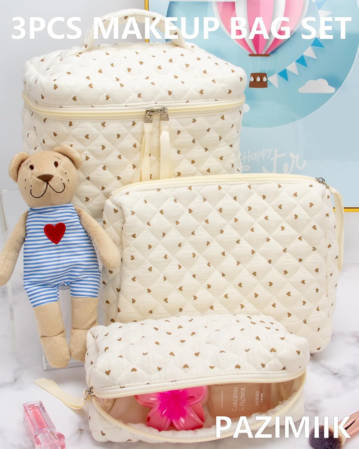 PAZIMIIK 3PCS Makeup Bag SET Large Travel Quilted Zipper Soft Cosmetic Case Pouch for Women Girls Make Up,Gauze Heart Coffee