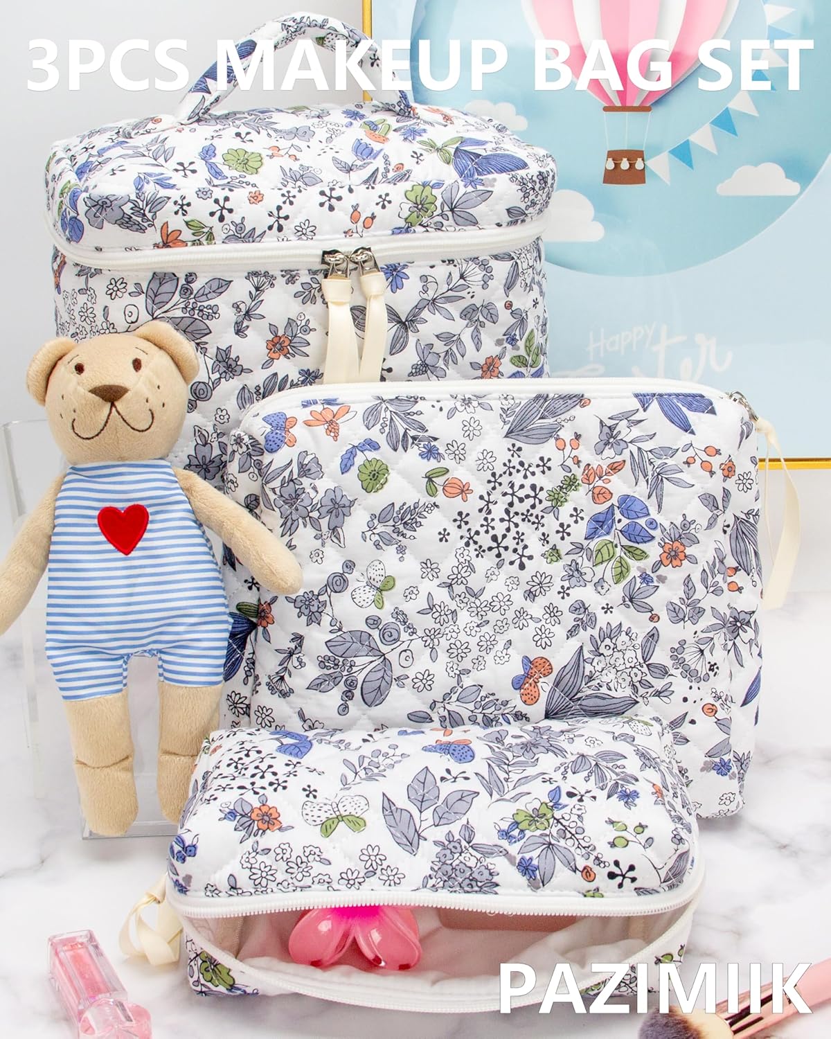 PAZIMIIK 3PCS Makeup Bag SET Large Travel Quilted Zipper Soft Cosmetic Case Pouch for Women Girls Make Up,Leaf White