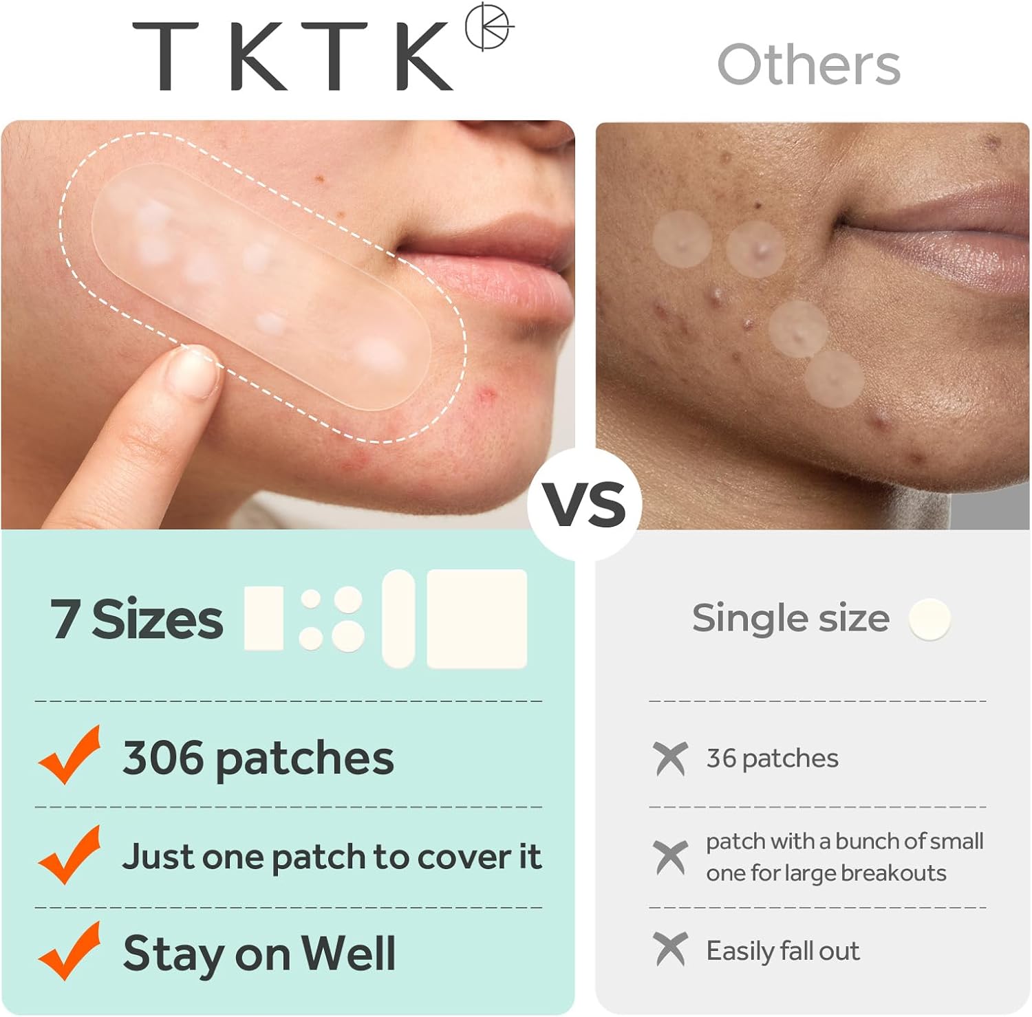 - 7 Sizes, 306 Patches for Every Need: TKTK large pimple patches come in 7 sizes (31x18mm, 60x20mm, 60x60mm, 8mm, 10mm, 12mm, 14mm), designed to target acne on various areas like your face, back, chest, chin or forehead. No matter the size or location, our hydrocolloid patches effectively fit and provide the coverage you need