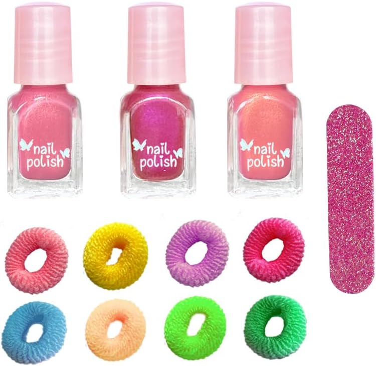 - 3 Quick-Dry Nail Lacquers + 5 Velvet Hair Jewels Includes salon-quality nail colors and cloud-soft hair ties in matching hues. All formulas are water-based and low-odor for fuss-free creative play