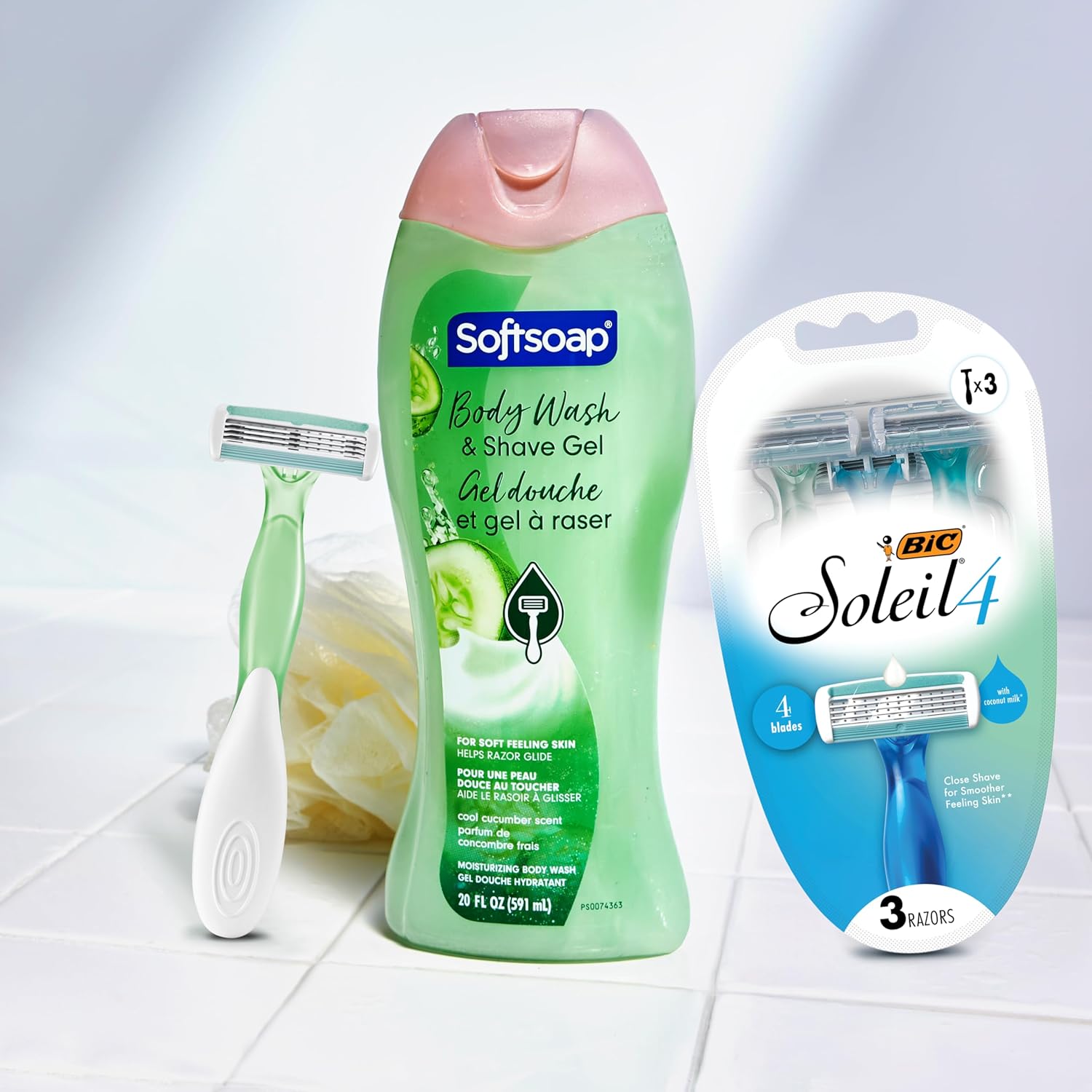 Softsoap Body Wash & Gel Cucumber, 20oz, pack of 1 + BIC Soleil Comfort 4-Blade Disposable Razors for Women Sensitive Skin Razor for a Smooth and Close Shave, 3 Piece Razor Set