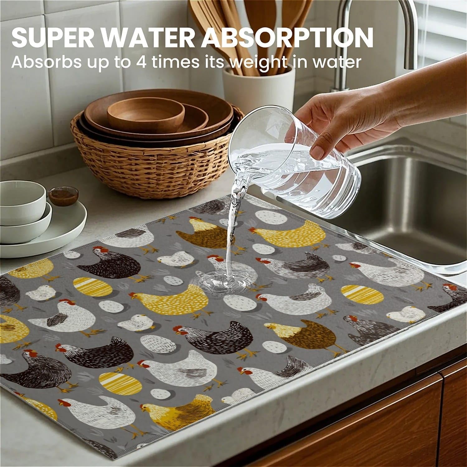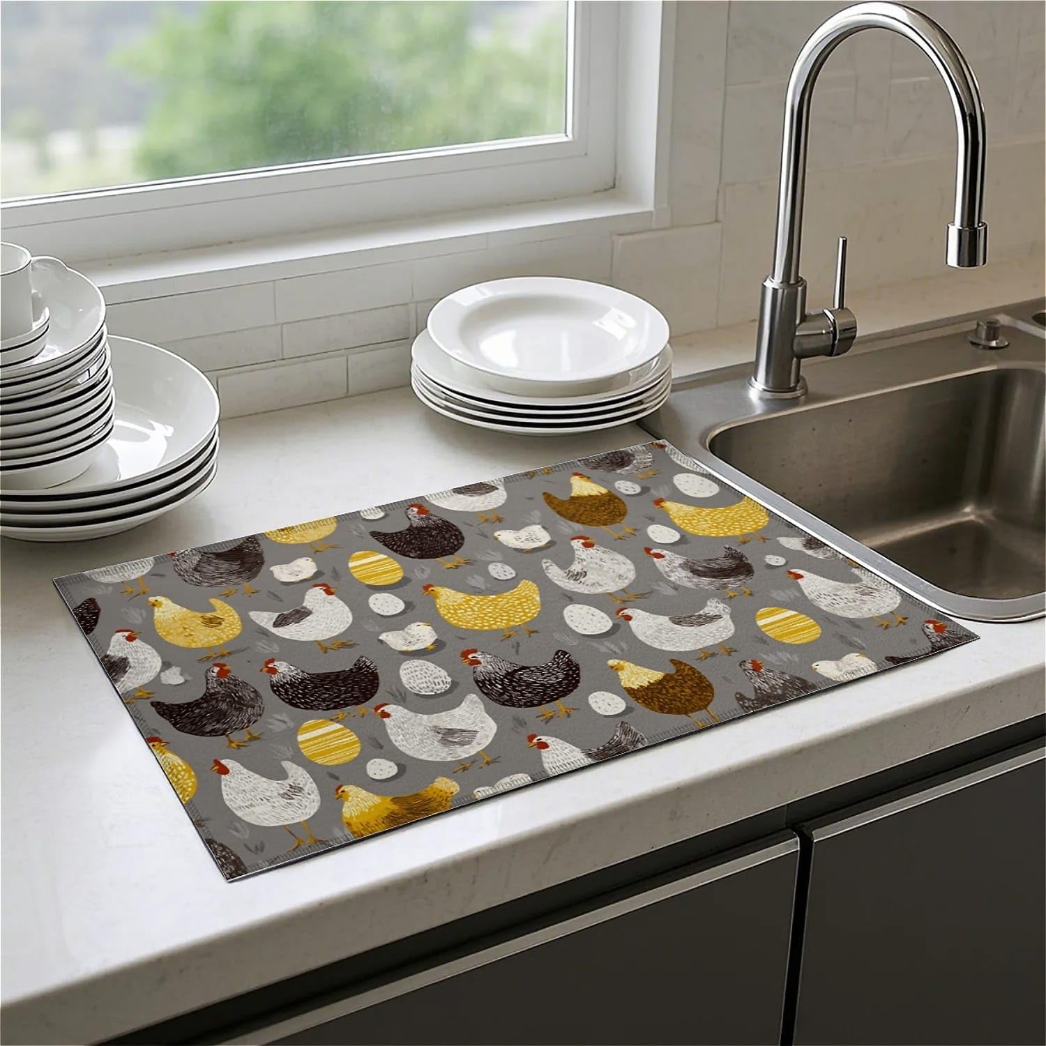Dish Drying Mat For Kitchen Counter, Hens Roosters Chicken Microfiber Absorbent Dish Drainer Rack Pad Reusable Large 18x24in Drying Mat
