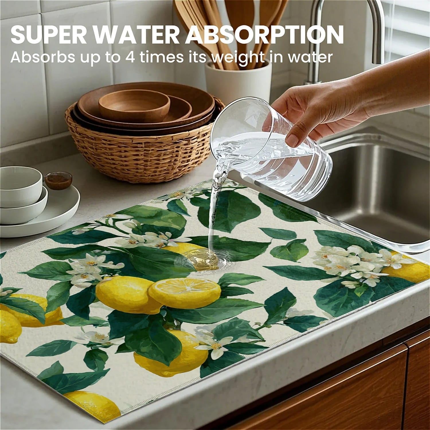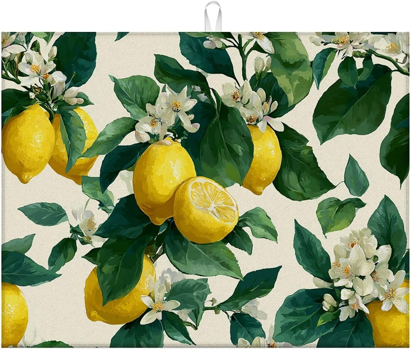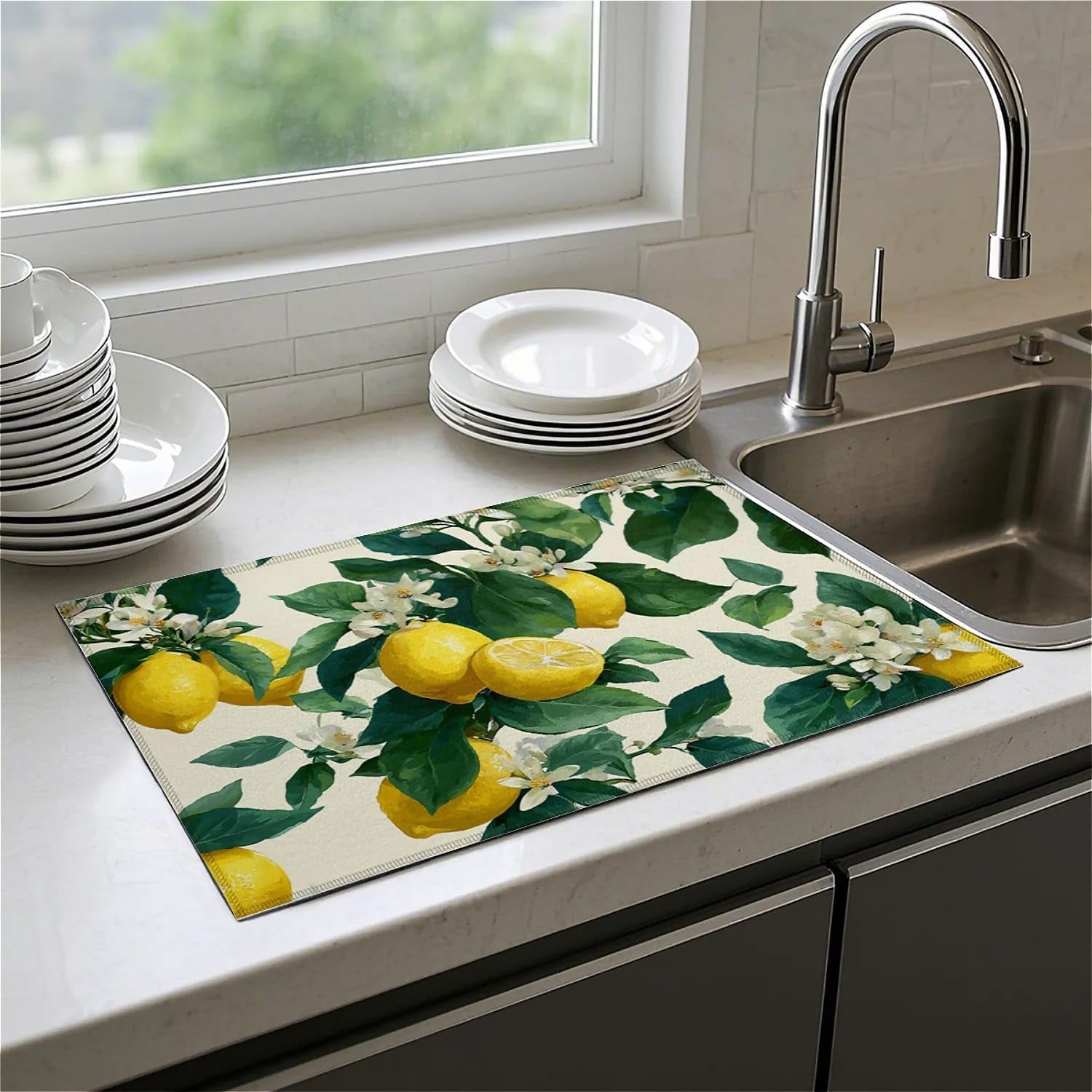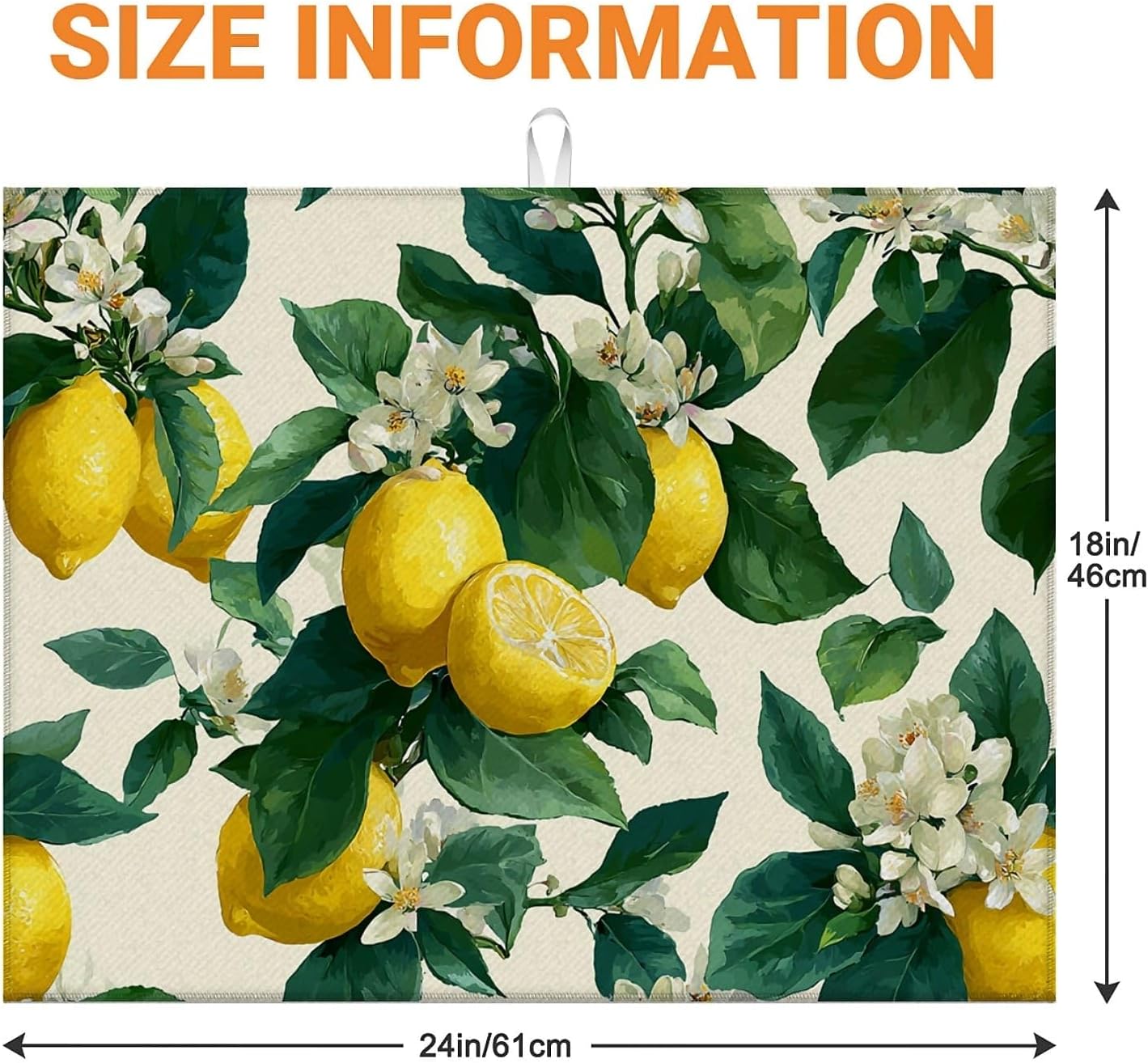 Dish Drying Mat For Kitchen Counter, Lemon Microfiber Absorbent Dish Drainer Rack Pad Reusable Large 18x24in Drying Mat