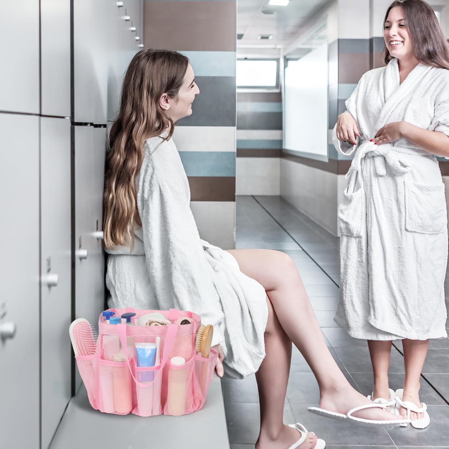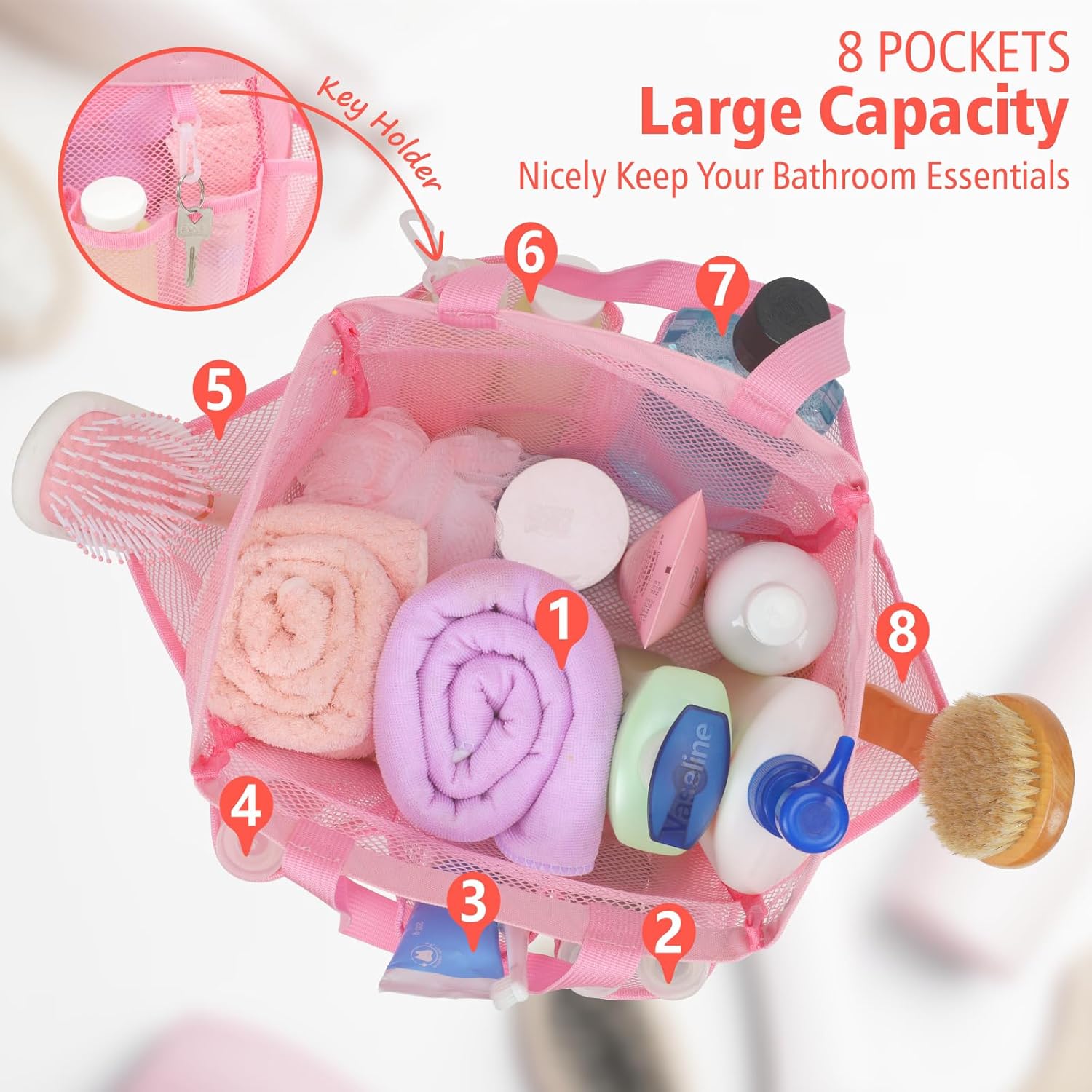 F-color Mesh Shower Caddy Portable, Upgrade Deeper 7 Pockets Shower Bag Basket Tote for College Dorm Room Toiletry Bathroom Essentials Gym Camp Quick Dry 2 handles with S Hook, Pink
