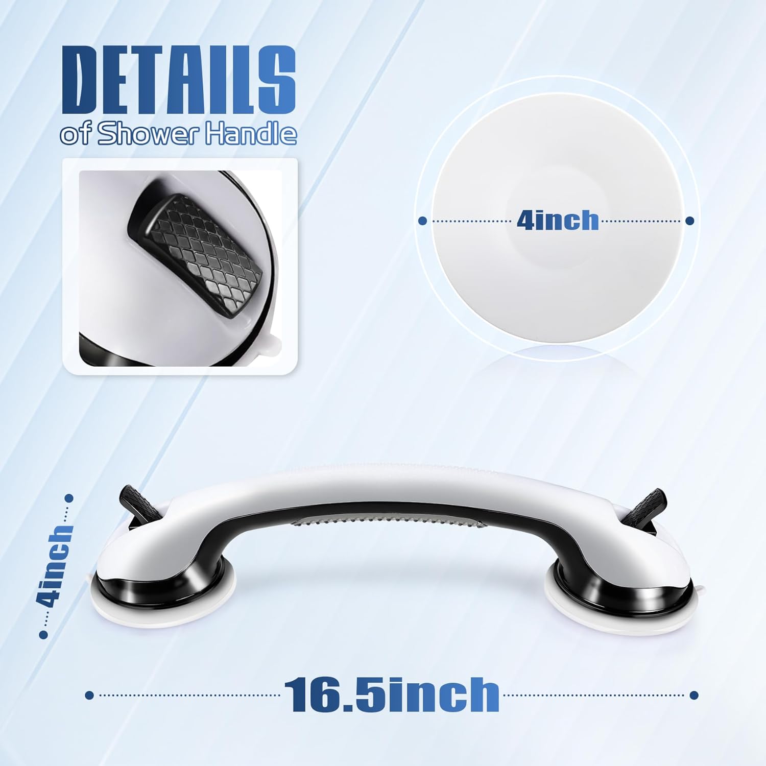 - Comfort Grip, Long-Lasting Build - Shower grab bars suction crafted from durable plastic with flexible rubber suction cups, the ergonomic shower handle offer a secure, non-slip grip. Measuring 16" × 4", the grab bars for shower are perfectly sized for daily stability and comfort.