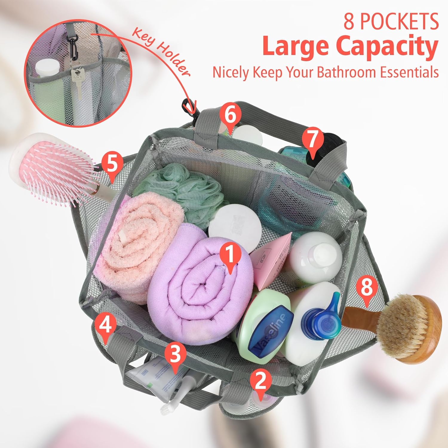 F-color Mesh Shower Caddy Portable, Upgrade Deeper 7 Pockets Shower Bag Basket Tote for College Dorm Room Toiletry Bathroom Essentials Gym Camp Quick Dry 2 handles with S Hook, Grey