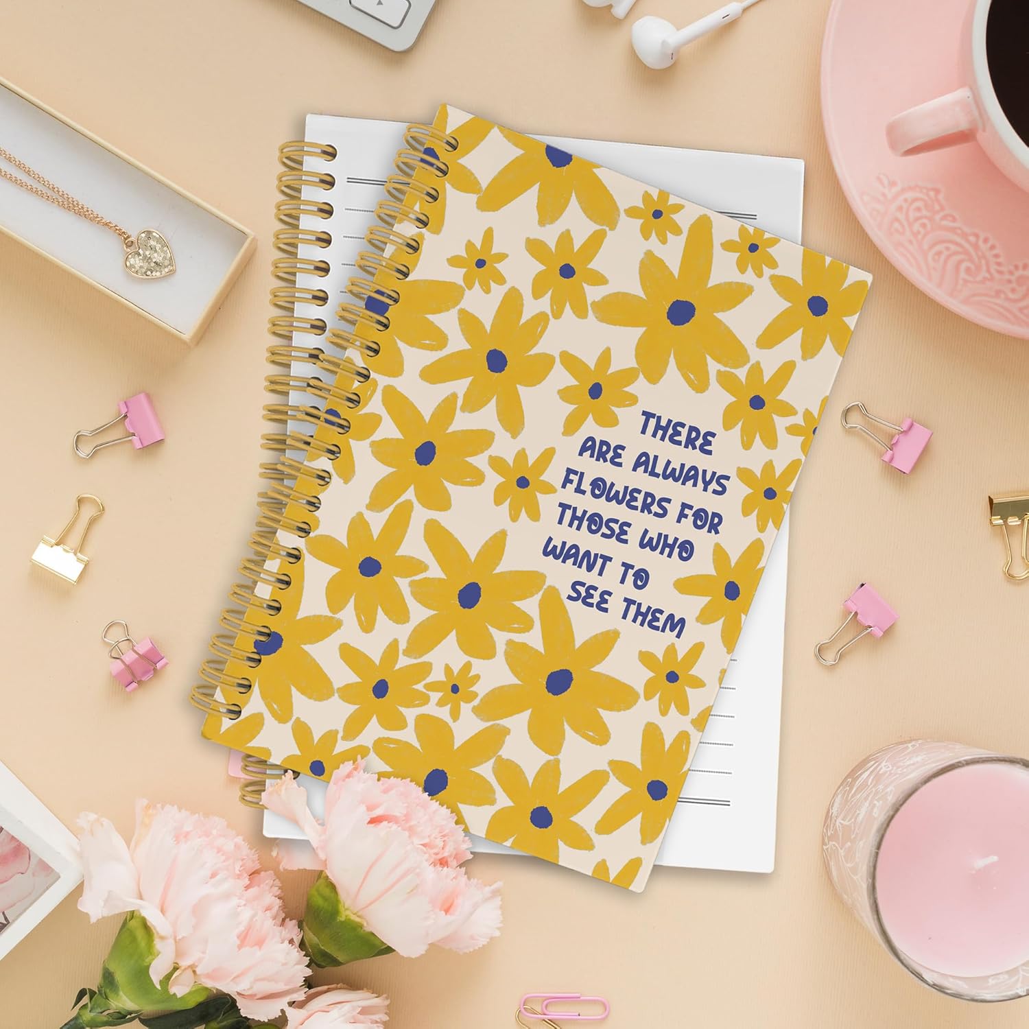 Inspirational Yellow Floral Spiral Notebook, Motivational Floral Journaling Notebooks for Note Taking, Flower Hardcover Journals for Women 160 Pages 5.5x8.3 Inch, Mental Health Gifts for Women