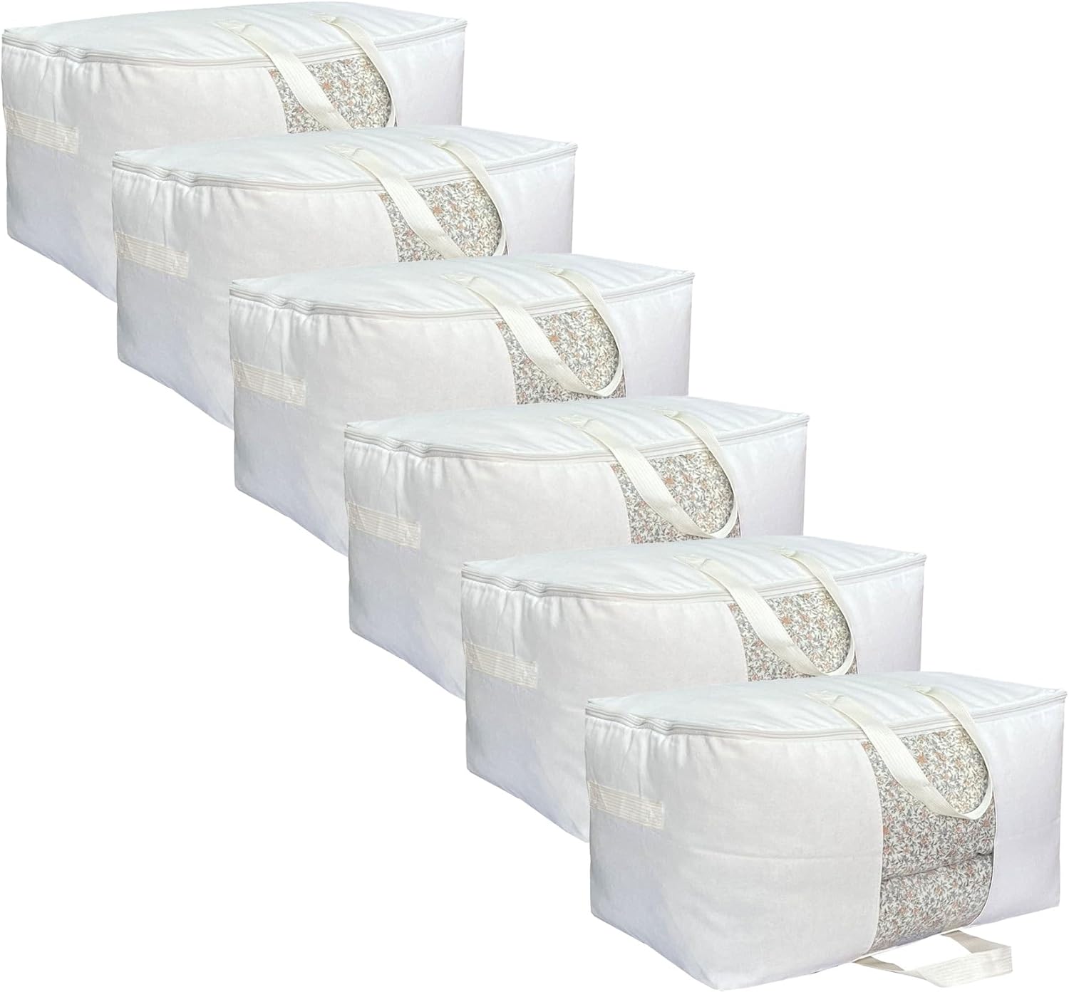 Soft Canvas Clothes Storage Bags with Four Carrying Handles and Clear Window, Closet Organizer for Clothing, Blankets Sheets Pillows and Bedding, 55L, 6 Pack, White
