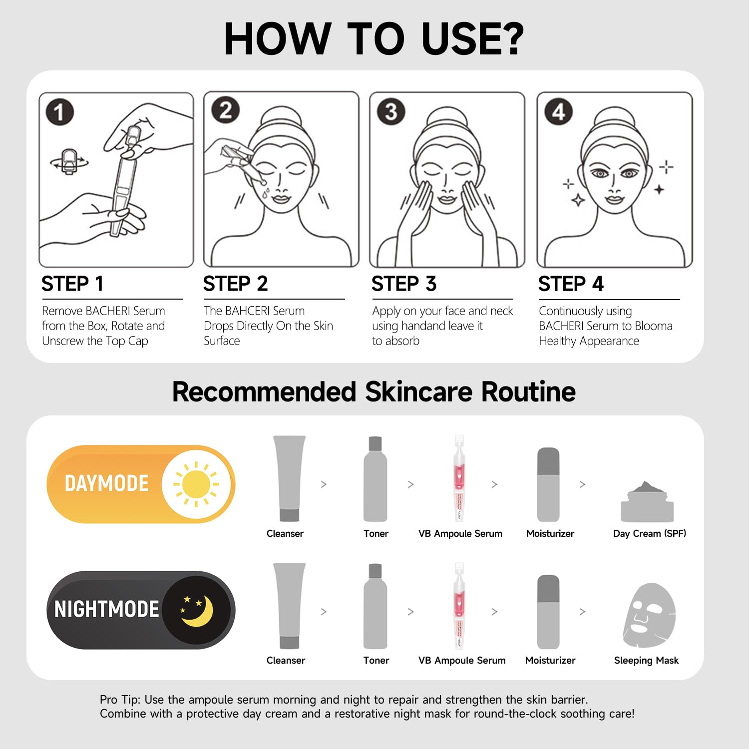 - Convenient BACHERI Ampoules Serums – Each 1.5ml ampoule delivers a hygienic, precisely measured dose, keeping the formula fresh and potent. Perfect for travel or daily use. How to Use: Hold the upper and lower parts of the ampoule, then use two fingers and snap to open.