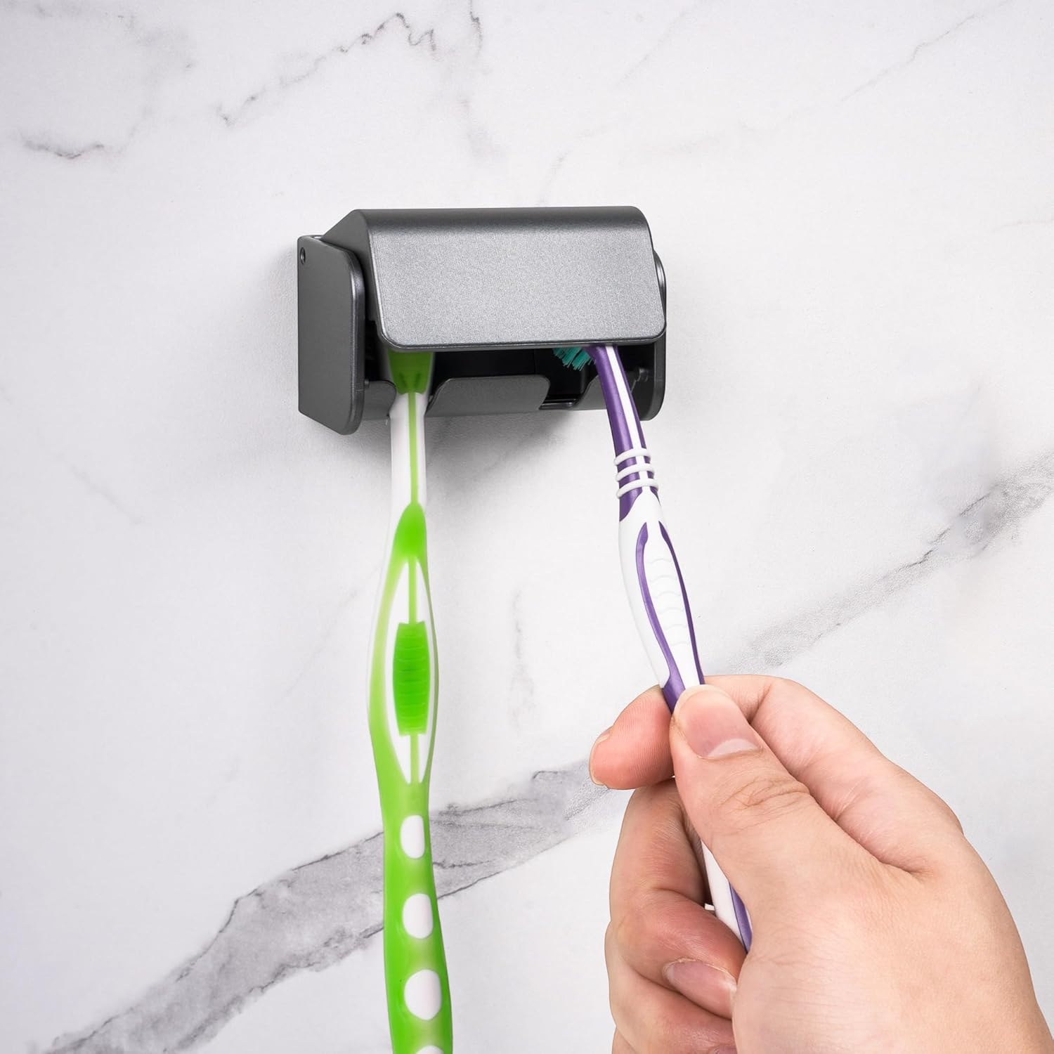 Toothbrush Holder Wall Mounted with Cover for Bathroom, 2 Slots Toothbrush Storage Organizer for Shower, Self Adhesive Toothbrush Hanger Rack for Dorm, Cabinet (Brushed Grey)
