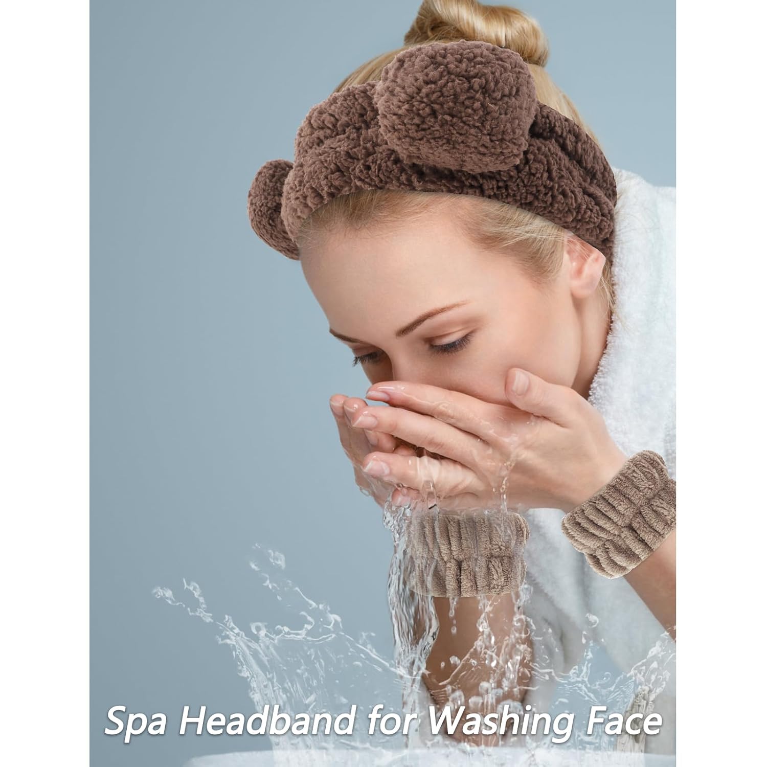 VELSCRUN Spa Headband, Makeup Face Wash Skincare Headbands, 5 Pcs Sponge Get Ready Bear Ears Hairband Facial Wristband Hair Clip Set, Stuff for Teen Girls Women Trendy Hair Accessories Dark Brown