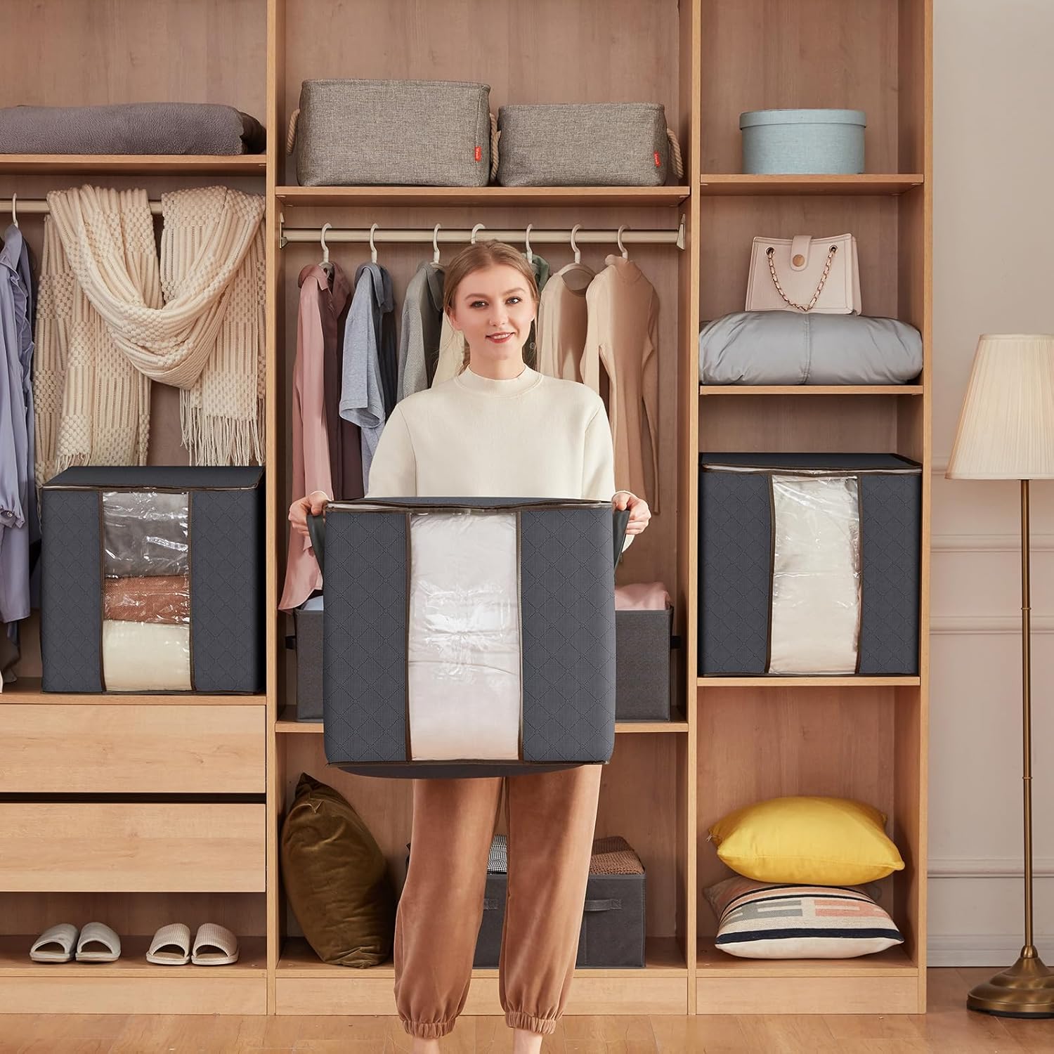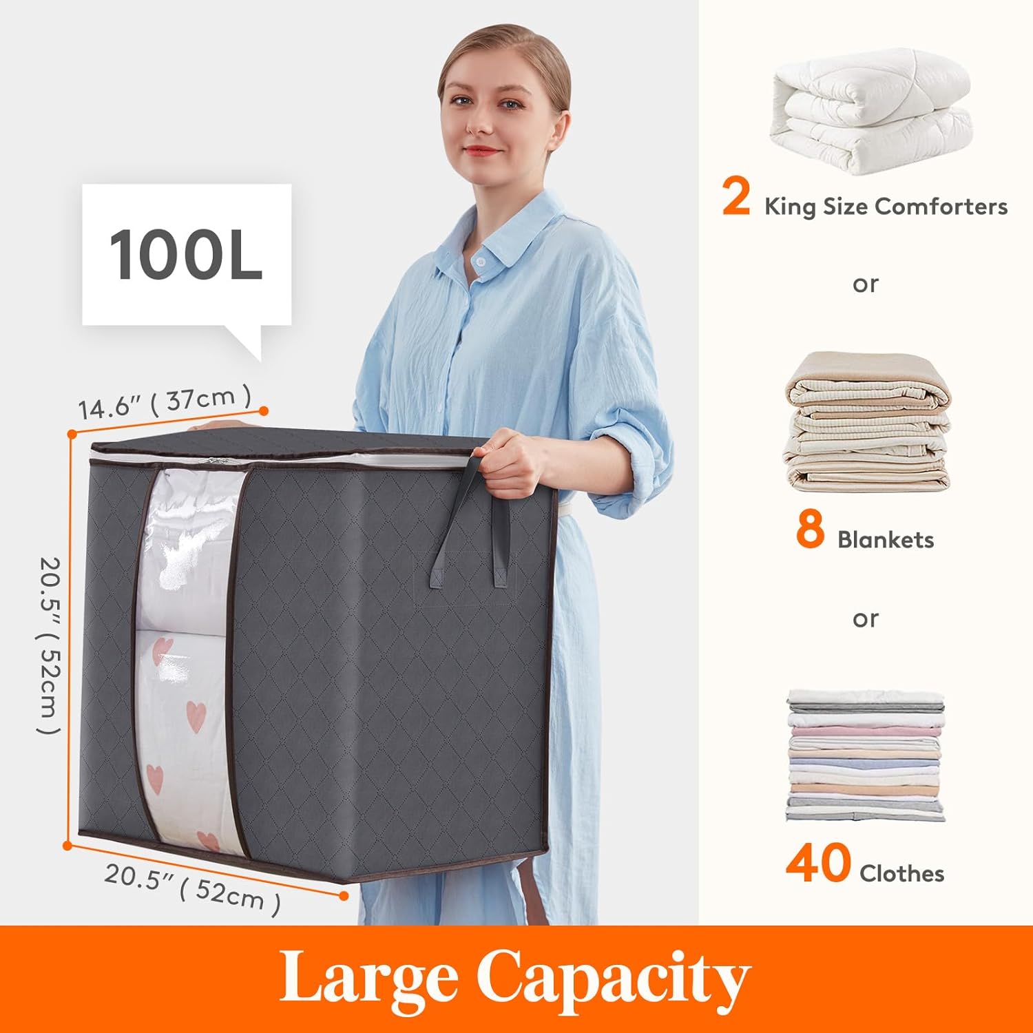 - Large Size: Each comforter storage bag size is 20.5"(52 cm) × 14.6"(37 cm) × 20.5"(52 cm), with capacity 100L. It is suitable to store comforters, blankets, clothes, pillows