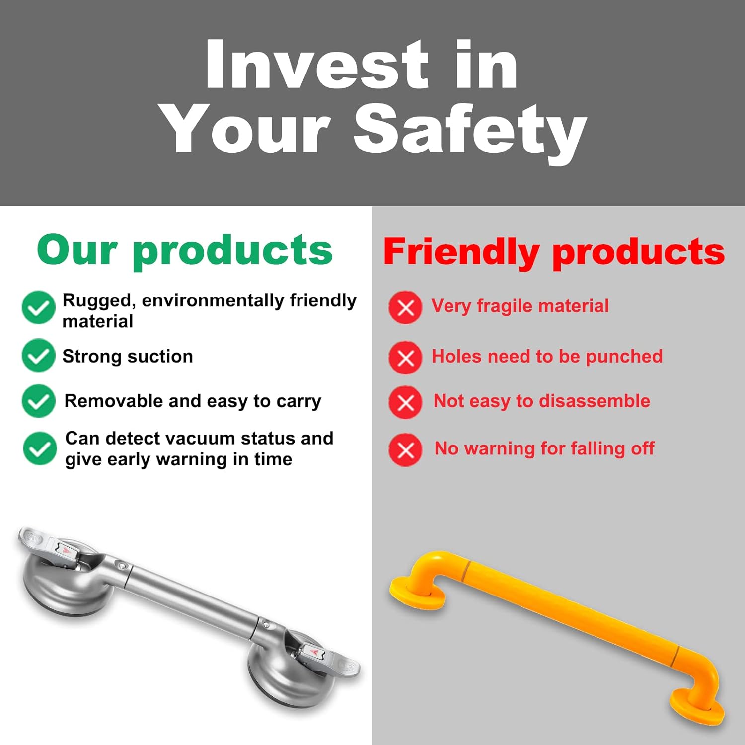 - 🌼One More Tip--Please be kindly reminded that for your safety. Carefully check the suction power of the grab bars before each use. If grab bars for bathtubs and showers has become loose, please reapply it. Suction cups need to be reset once a week at least for renewing vacuum state.