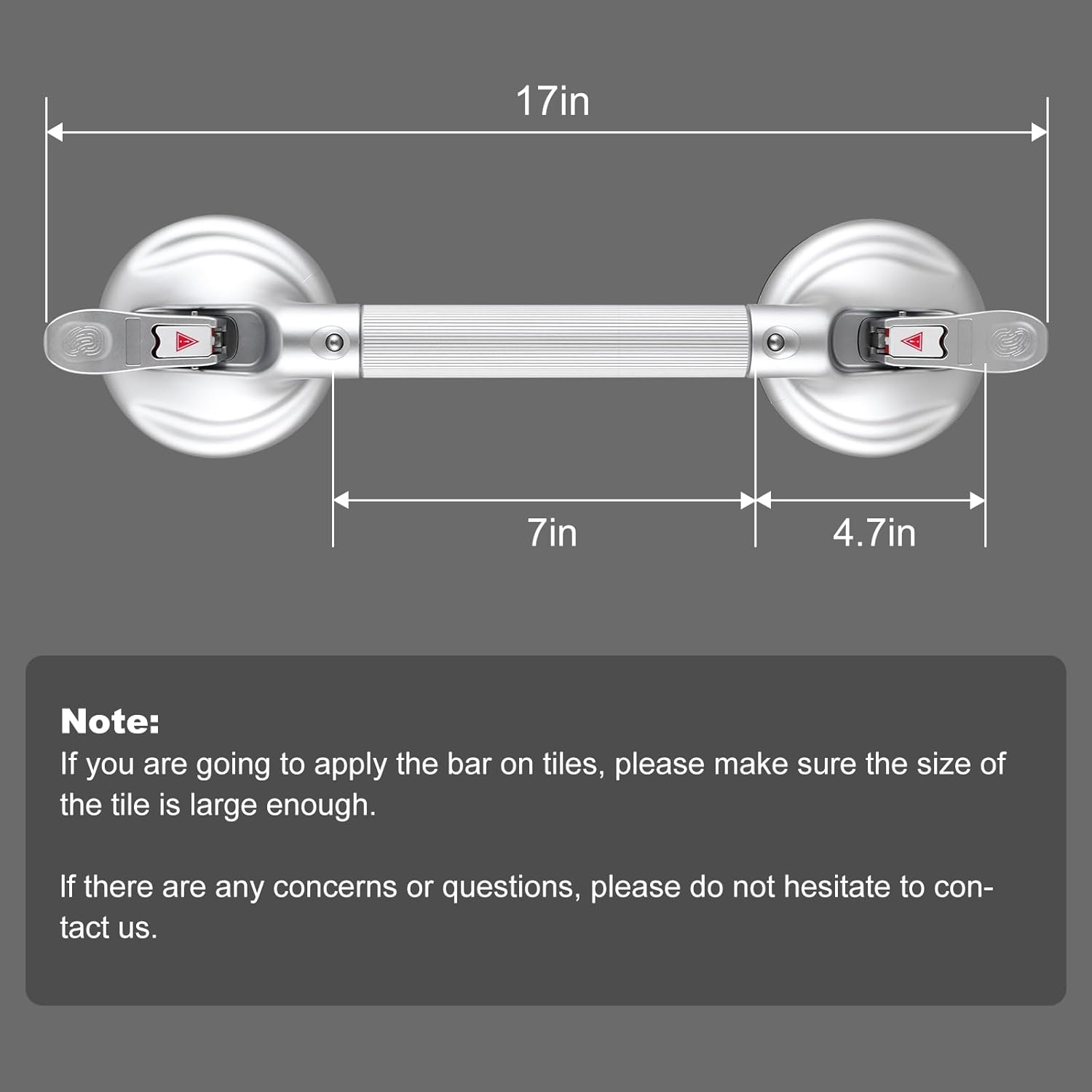 - đăBuying Guidesă â The grab bar is to be used only to assist and help support properly a person's body, Never apply full body weight. ⥠The mounting surface of the grab bars for elderly suction must be flat, non-porous, and smooth. And measure tiles and the distance between them prior to purchase as suction cups cannot overlap the grout line. ⢠Check the stability of the suction cup periodically. Use with caution and test-proof the suction of cups before use.