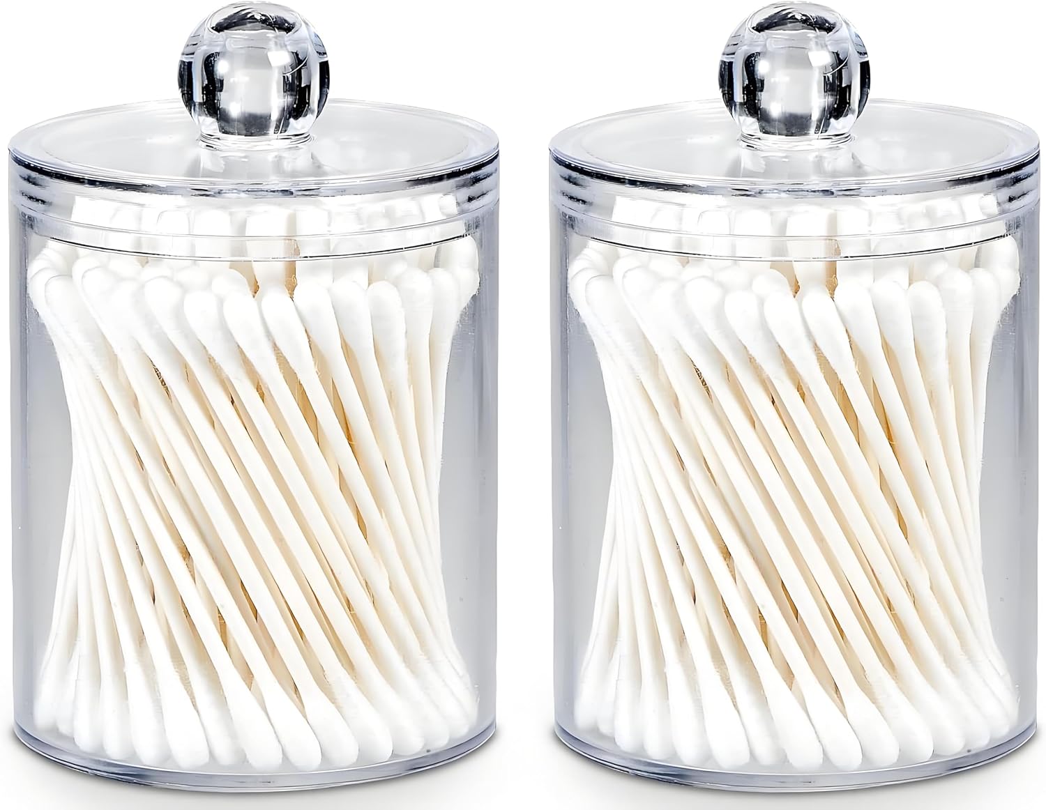 AXX Qtip Dispenser Apothecary Jars Bathroom - Qtip Holder Storage Canister Clear Plastic Jar for Cotton Swab,Q-Tips,Cotton Rounds (Clear 2Pcs)