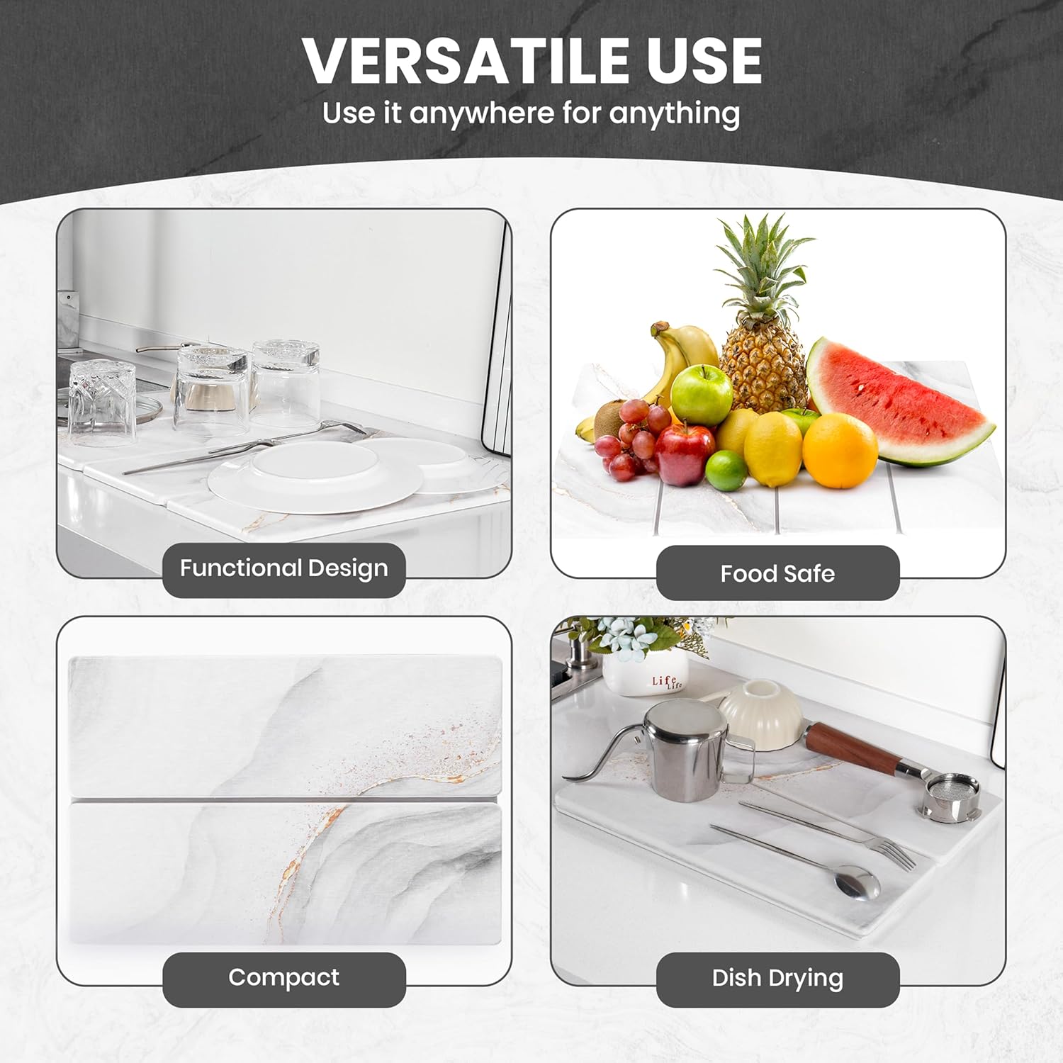 Dusk & Decor Folding Stone Dish Drying Mat – Quick-Drying Diatomaceous Earth Kitchen Mat for Counter – Foldable, Non-Slip Diatomite Sink Tray for Dishes and Utensils - White