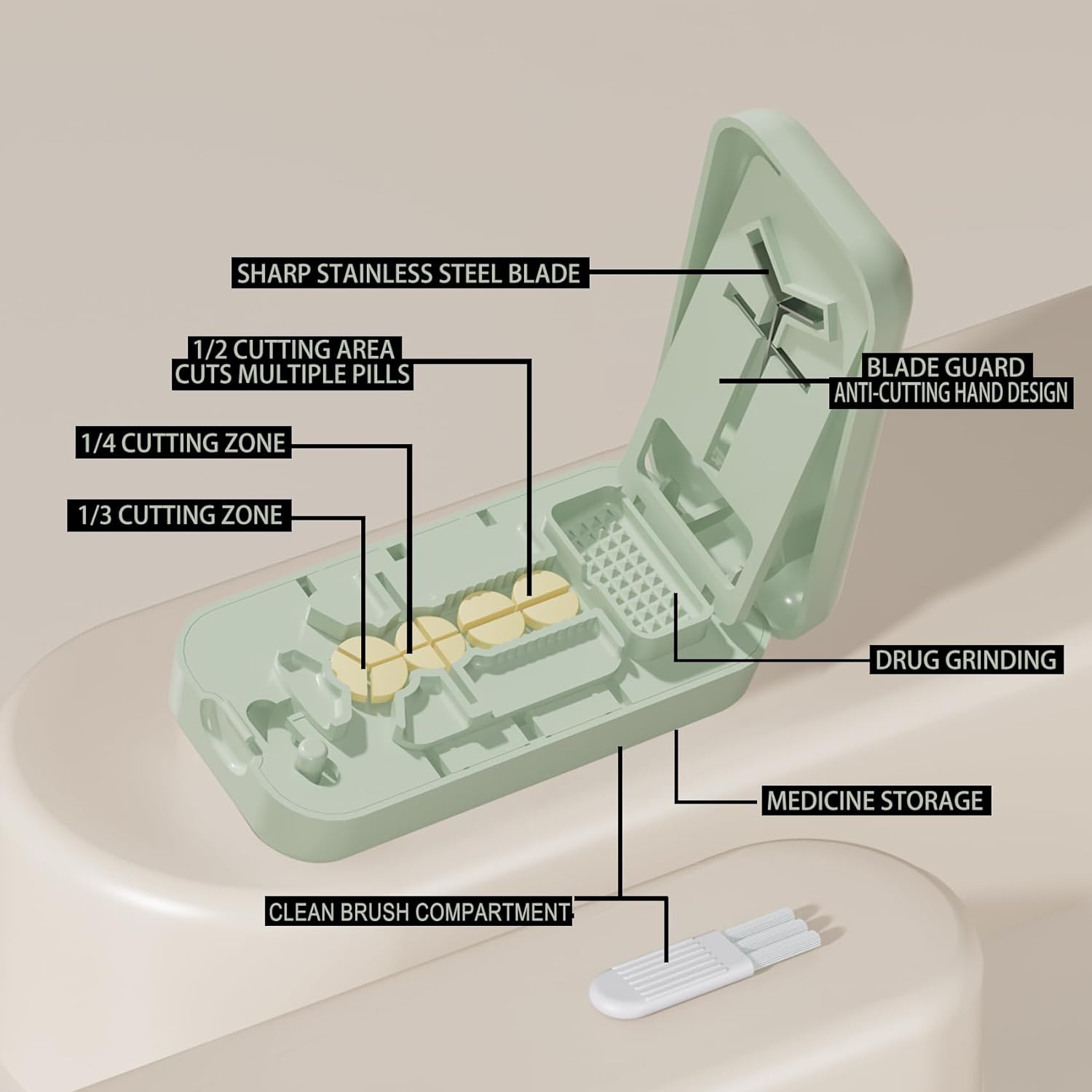 Precision Pill Cutter with Centering Guide - Multi-Angle Tablet Splitter for 1/2, 1/3 & 1/4 Cuts, Includes Pill Crusher & Storage Compartment (Green)