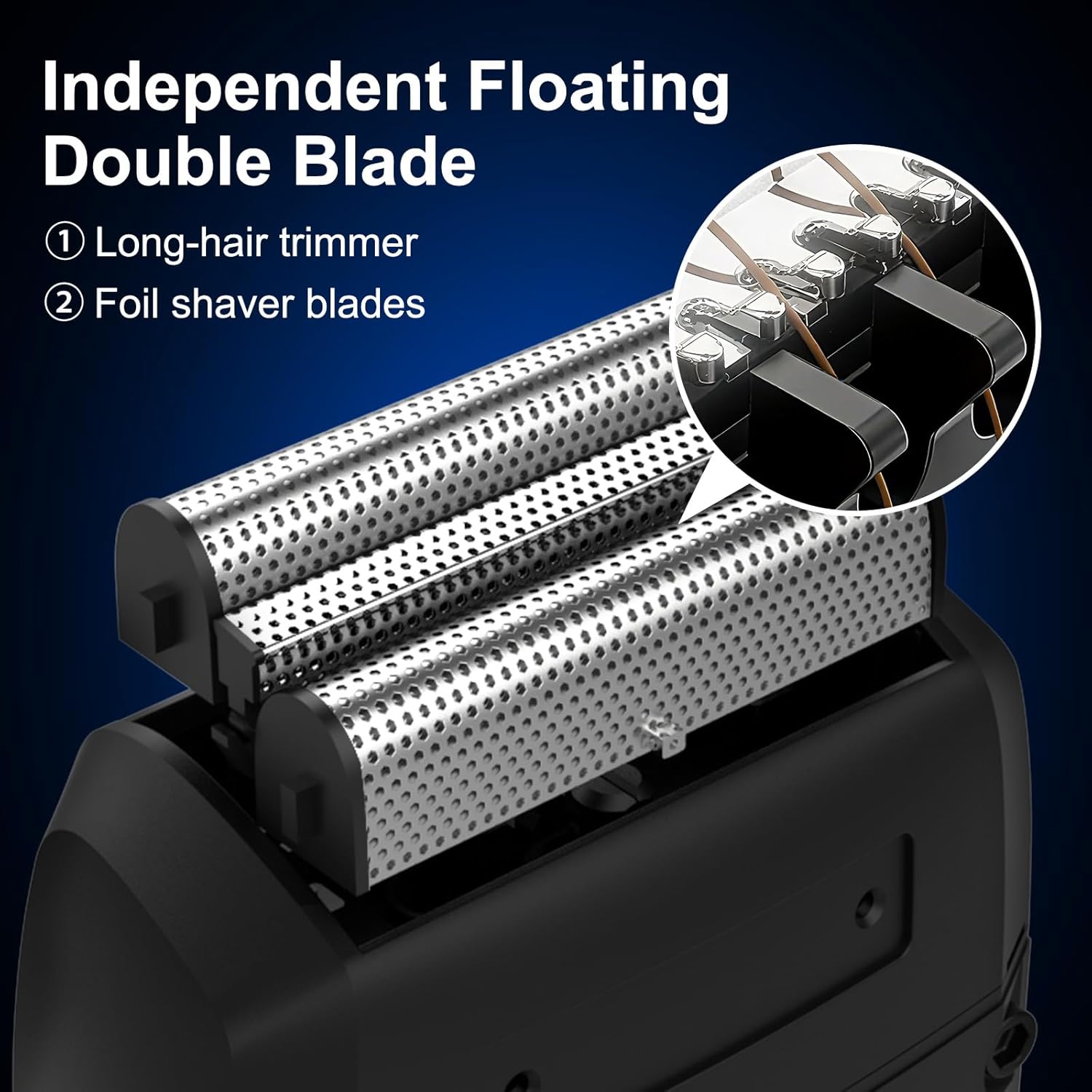 - Double Floating Razor: The electric shavers is equipped with intelligent dual floating shaving heads, and the slim and smooth foil blade mesh hugs the contours of your face, The electric foil shaver captures short, thicker whiskers and easily trims the face, neck, jaw without pulling on your beard, providing you with a comfortable and convenient shaving experience.