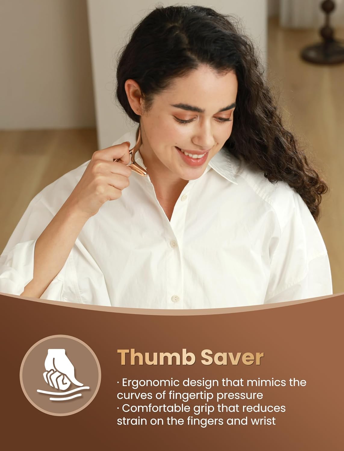 - Lymphatic Drainage Massager: The thumb saver is the ideal replacement for traditional thumb-based lymphatic drainage. By eliminating thumb strain, it ensures a far more comfortable experience. It helps to reduce puffiness and enhance circulation.