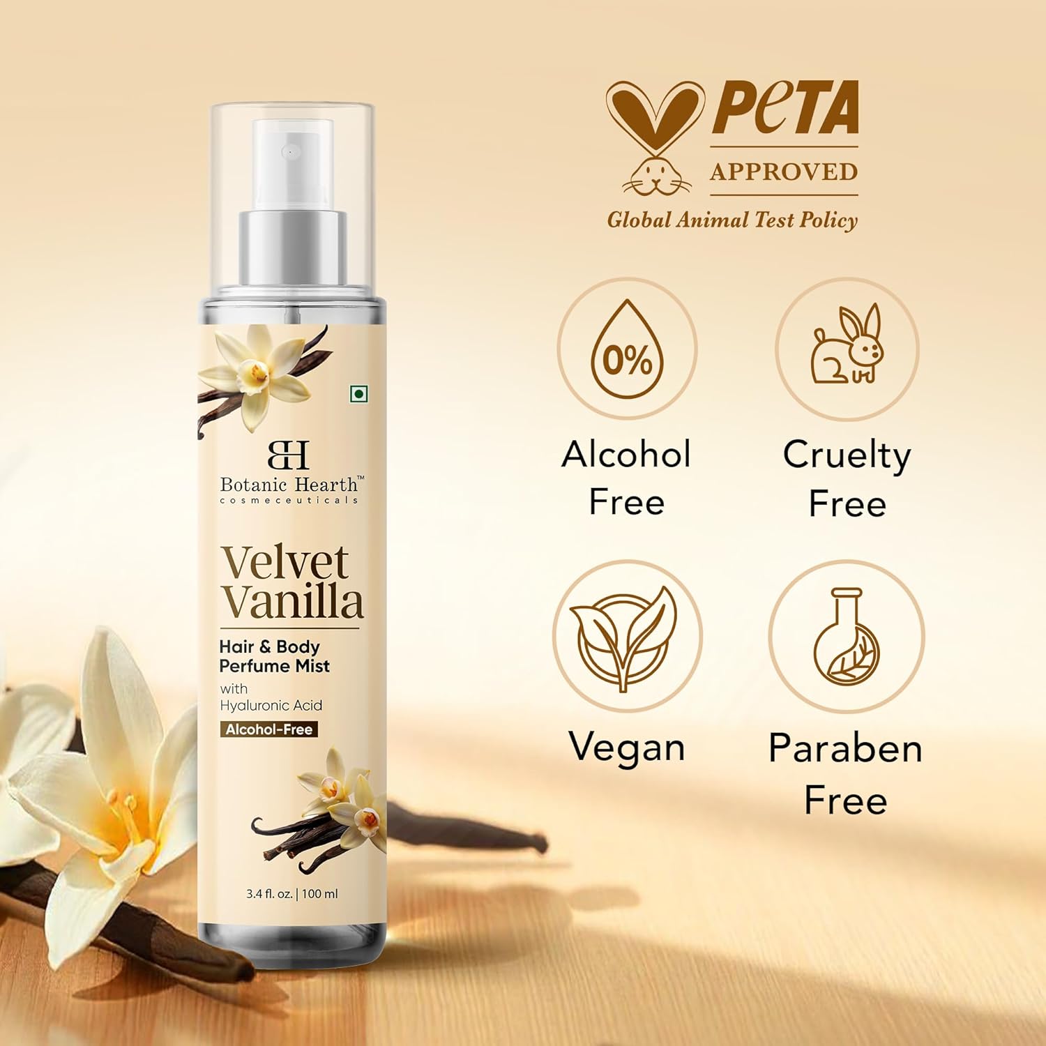 Botanic Hearth Velvet Vanilla Hair & Body Perfume Mist with Hyaluronic Acid, Alcohol-Free Formula, Long Lasting Fresh Vanilla Scent, Lightweight Body Spray for Women & Men, 3.4 fl oz / 100 ml