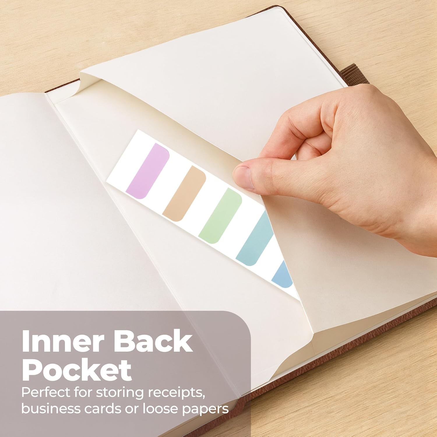 - DESIGNED WITH FUNCTIONAL FEATURES – Stay organized with built-in back pocket for storing receipts, business cards, and keepsakes. The elastic closure band keeps pages secure on the go and the ribbon bookmark makes it easy to find important sections. A pen loop so your writing tool is always handy. Plus, it also comes with free sticky tabs to mark pages, organize sections, and quickly find your most important notes!