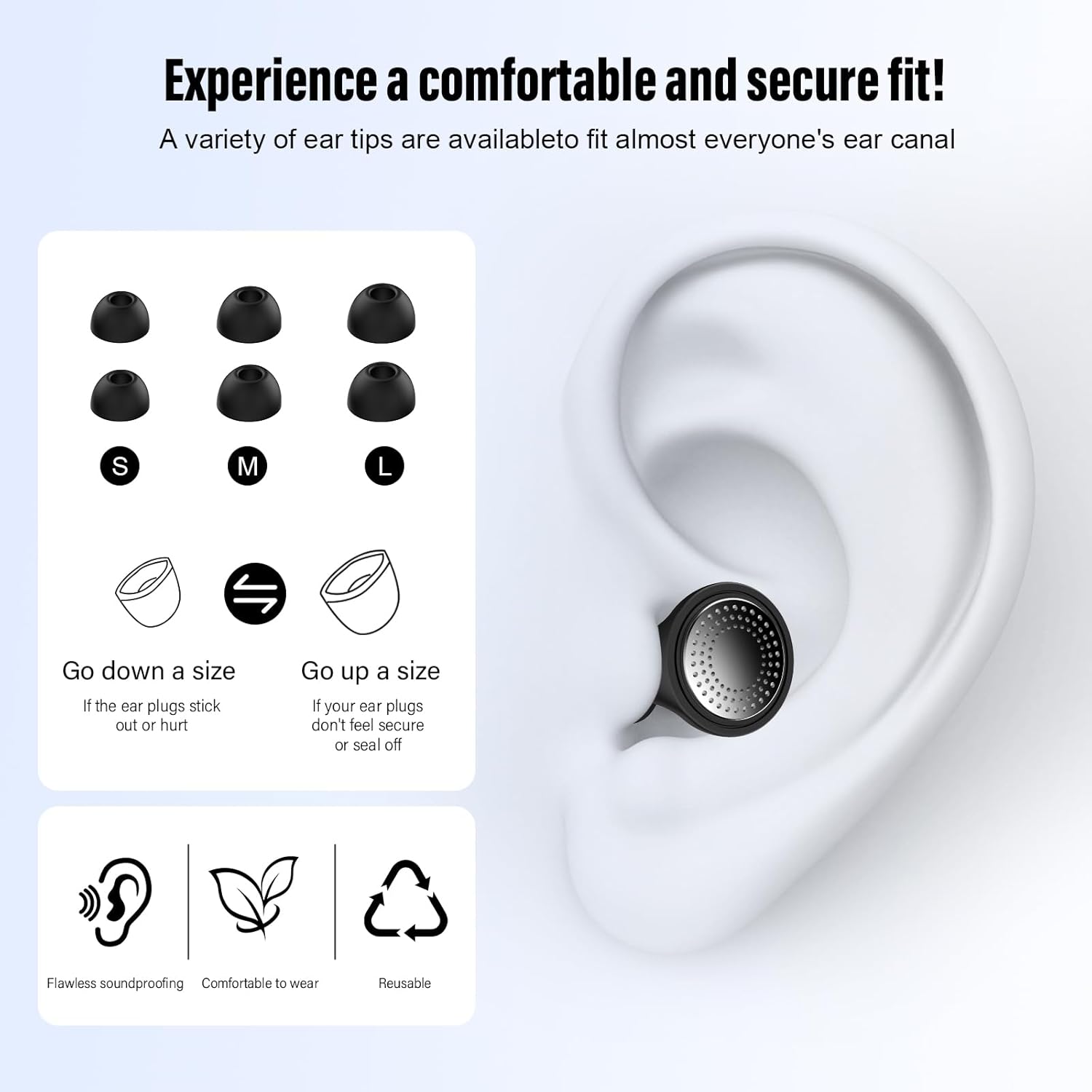 - Two Comfort Options for Personalized Fit: Earplugs for sleep choose between slow-expanding memory foam for a custom noise-blocking seal or hypoallergenic silicone tips in three sizes (S/M/L). Both options stay securely in place all night without pressure or discomfort, perfect for side sleepers and active users.