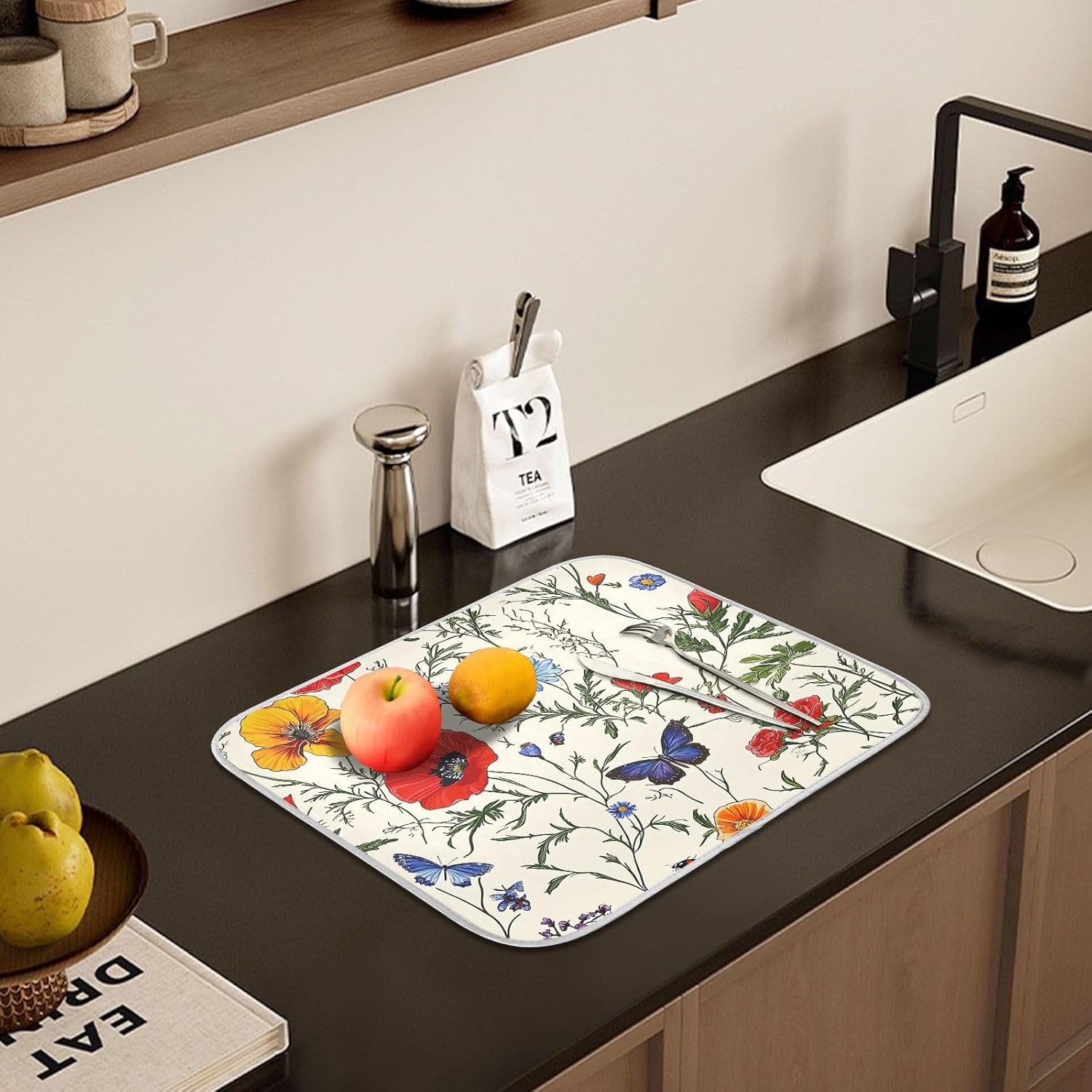Butterfly Red Tulip Wildflower Dish Drying Mats for Kitchen Counter, 18x24 inch Drying Dishes Absorbent Microfiber Dish Drainer Mat Rack Pad Fast Dry