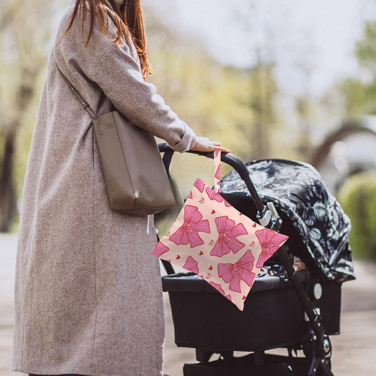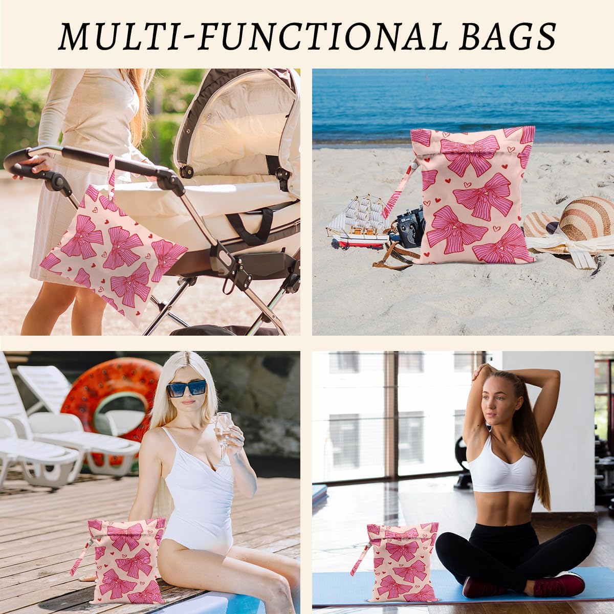 Pink Bow Wet Bags 12x10 Inch, Heart Waterproof Reusable Wet Dry Bags, Bow Tie Washable Travel Laundry Bag for Swimsuit Pool Beach Diapers Dirty Yoga Gym Clothes, Pink Gifts for Women Friend Travelers