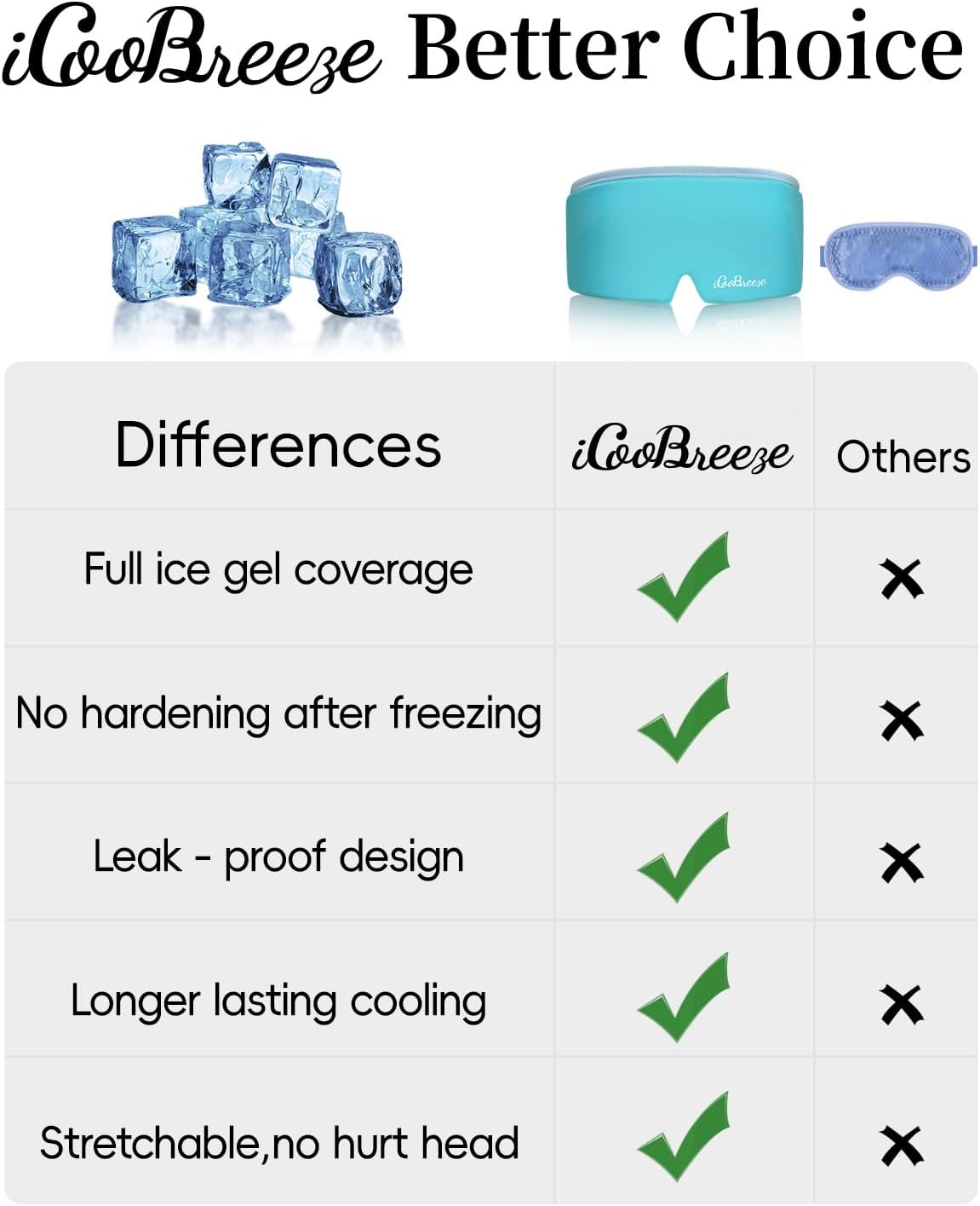 - ★WHY CHOOSE US?The iCooBreeze cooling eye mask is crafted with ultra-thick, non-toxic gel. The gel is evenly distributed, soft, and flexible—it never hardens or leaks, even after freezing. It stays cool for extended periods and is fully reusable.
