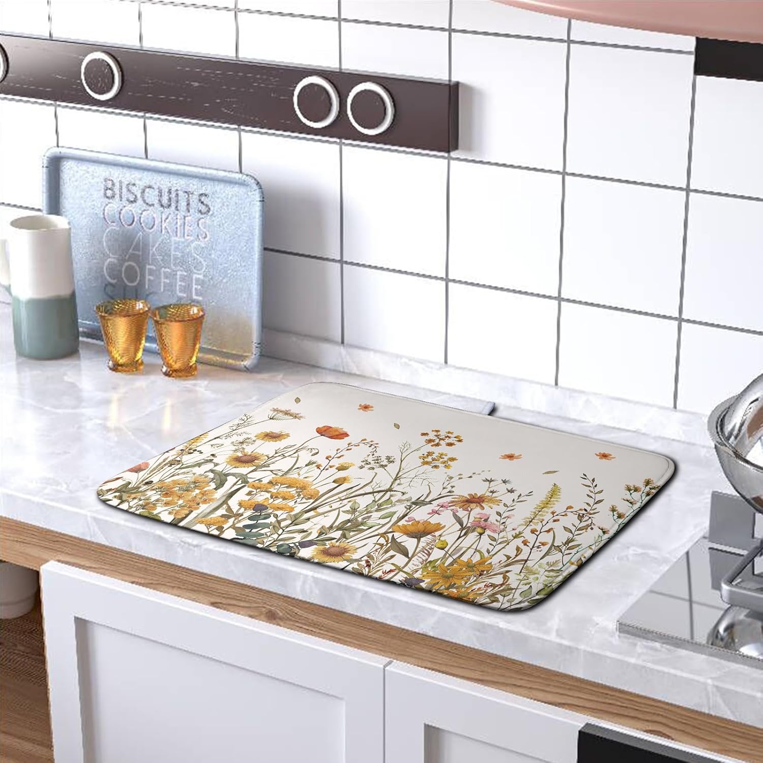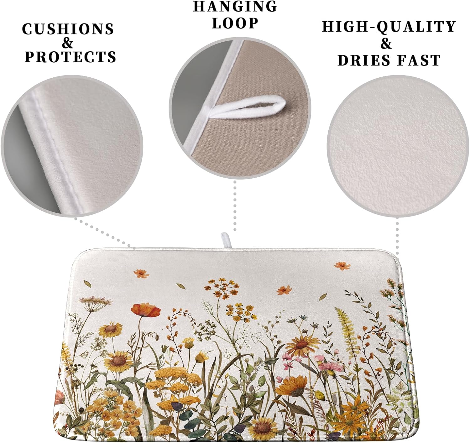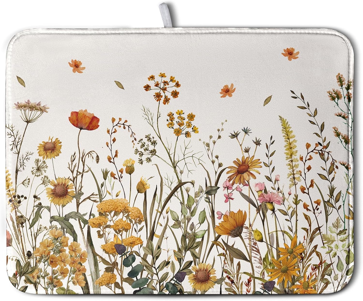 Fall Floral Dish Drying Mat for Kitchen Counter Autumn Burnt Orange Wild Flowers Dish Draining Mat Absorbent Microfiber Dishes Pad Washable Dish Drainer Rack Mat Large 18"x24"