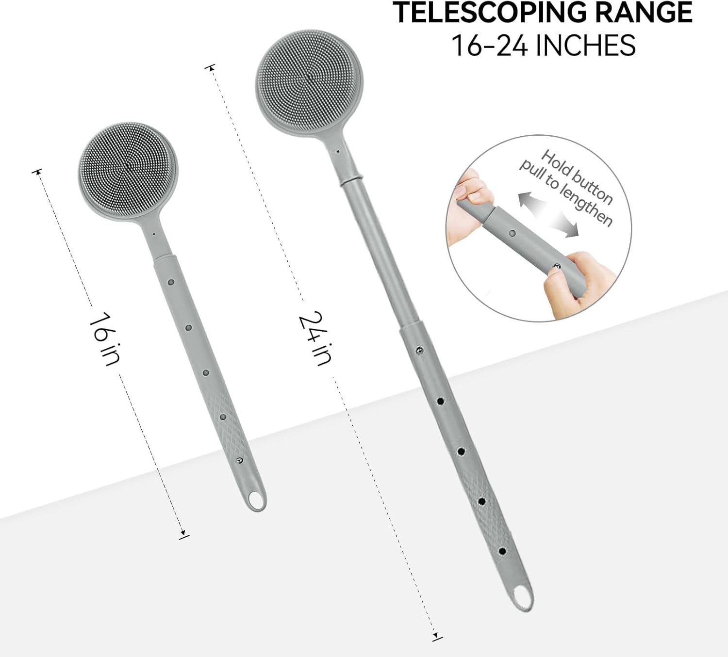 - Adjustable Long Handle with Secure Grip: Equipped with a stainless steel button for 5-level length adjustment (16-24 inches), this back brush reaches all body areas effortlessly,especially friendly to people with elderly and limited mobility. The ABS handle with anti-slip texture ensures firm control, even when wet, suitable as a back washer for shower men/women.