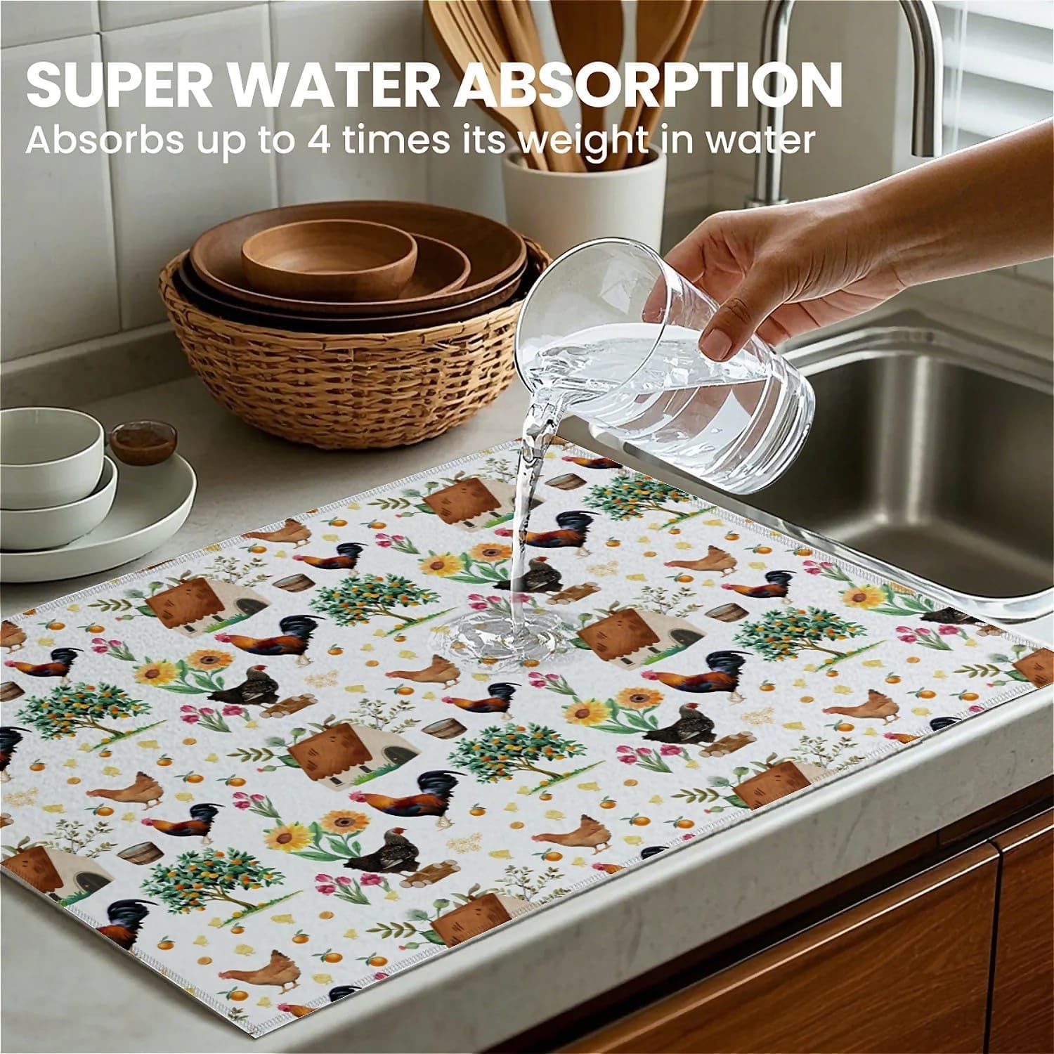 Dish Drying Mat For Kitchen Counter, Farmhouse Rooster Microfiber Absorbent Dish Drainer Rack Pad Reusable Large 18x24in Drying Mat