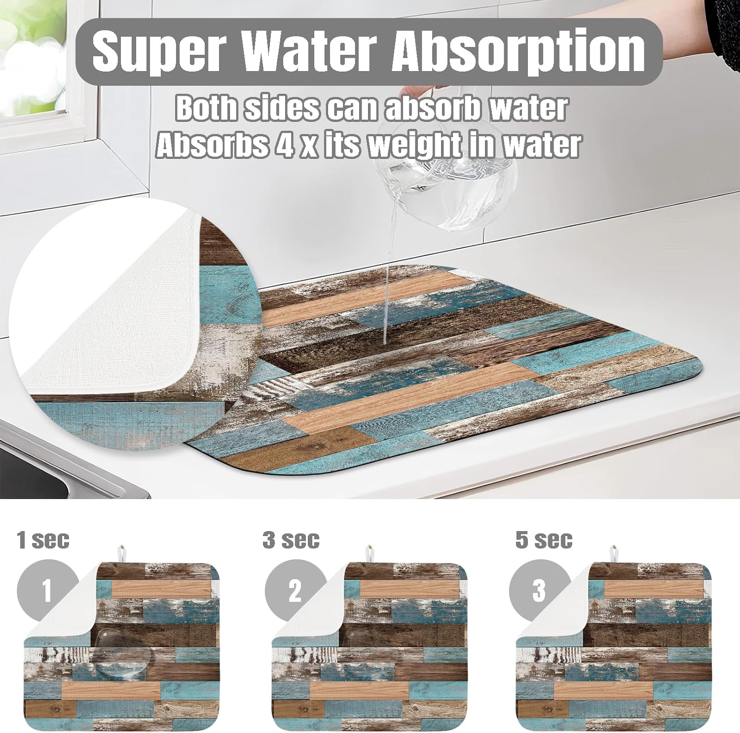 Dish Drying Mat for Kitchen Counter Large 18" x 24" Farmhouse Rustic Wood Absorbent Microfiber Dishes Drainer Rack Mats Pad Reusable Washable