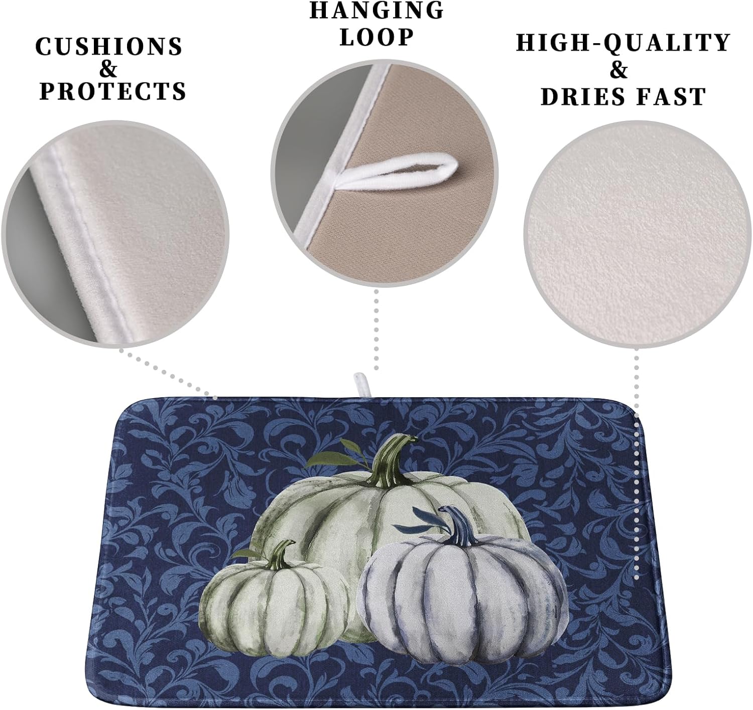 Autumn Dish Drying Mat Fall Navy Blue White Pumpkin Dish Pad for Kitchen Counter 16x18 Microfiber Absorbent Thanksgiving Dish Draining Mat Reusable Washable Dish Drainer Rack Mat
