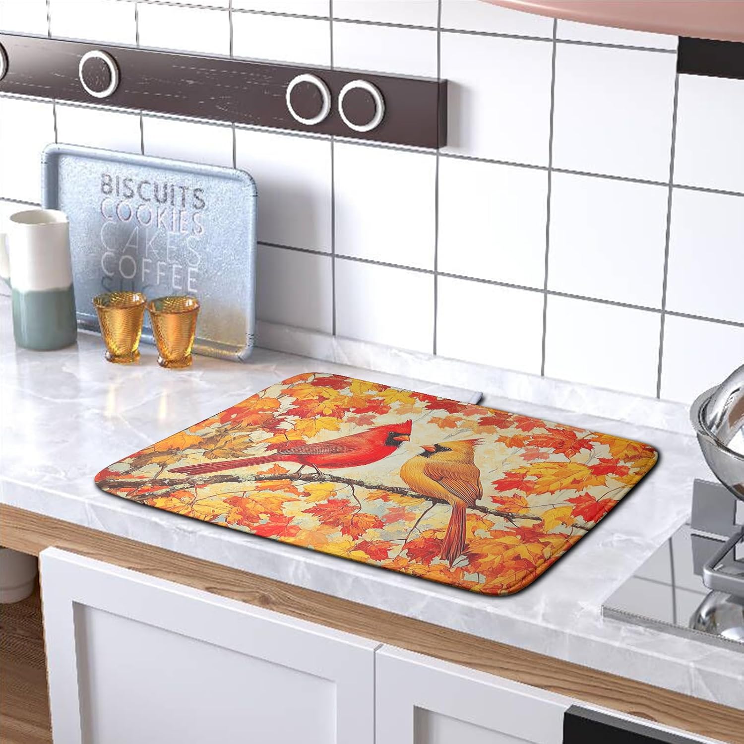Fall Dish Drying Mats for Kitchen Counter Maple Leaf Cardinal Birds Dish Draining Mat 18x24 Inch Autumn Thanksgiving Dish Rack Mat Microfiber Absorbent Dish Drainer Pad