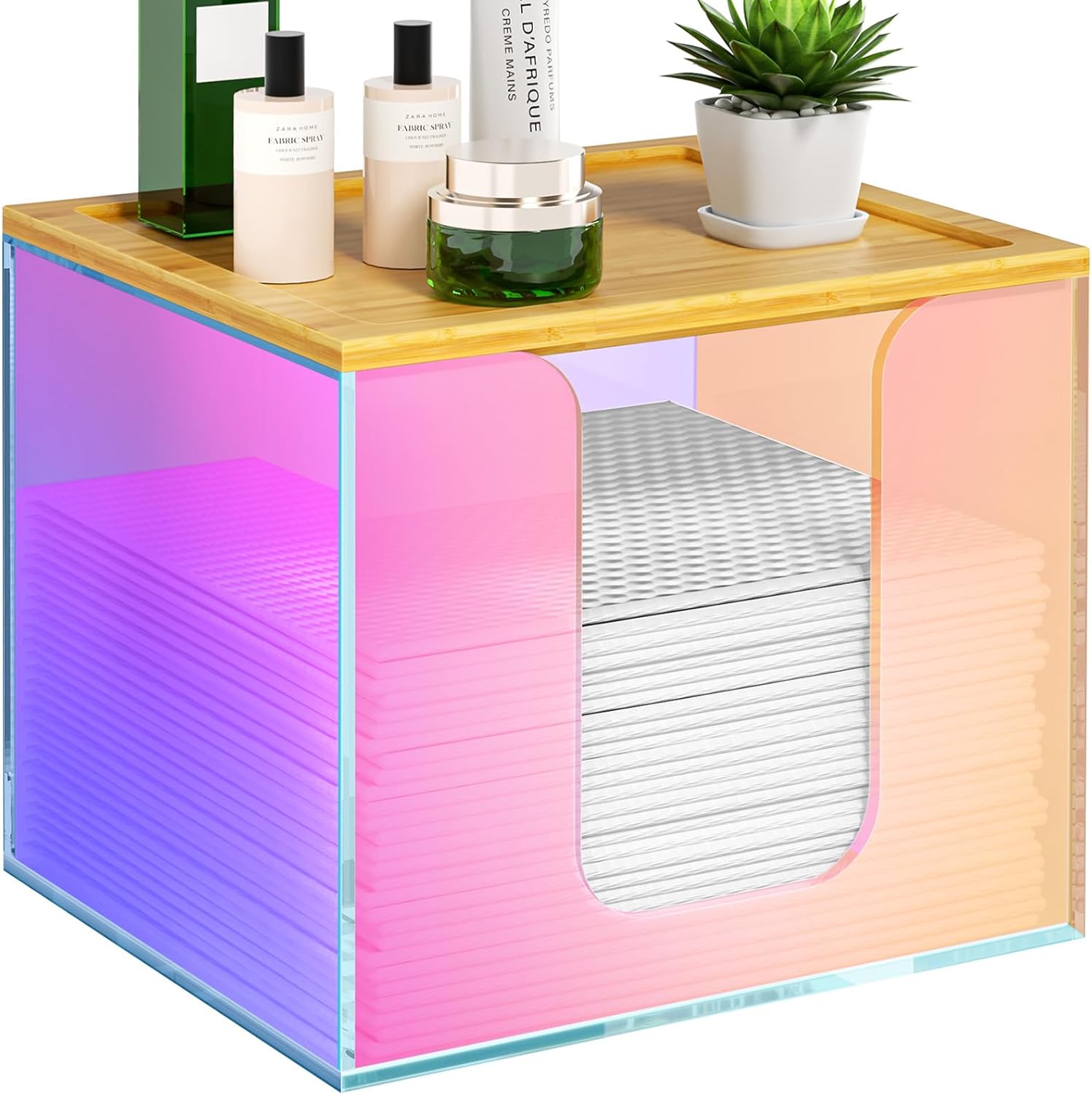 VITVITI Disposable Face Towel Holder Box, Acrylic Facial Towel Container for XL Clean Skin Club, Large Disposable Face Towels Storage with Bamboo Lid, for Bathroom, Vanity Makeup, Rainbow