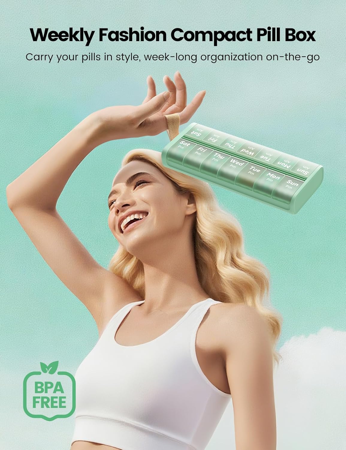 - 【Moisture-Proof & Light Protection】 An independent desiccant compartment and opaque lids keep tablets dry and shielded from light. This moisture-proof pill organizer preserves pill freshness and potency throughout your weekly routine.