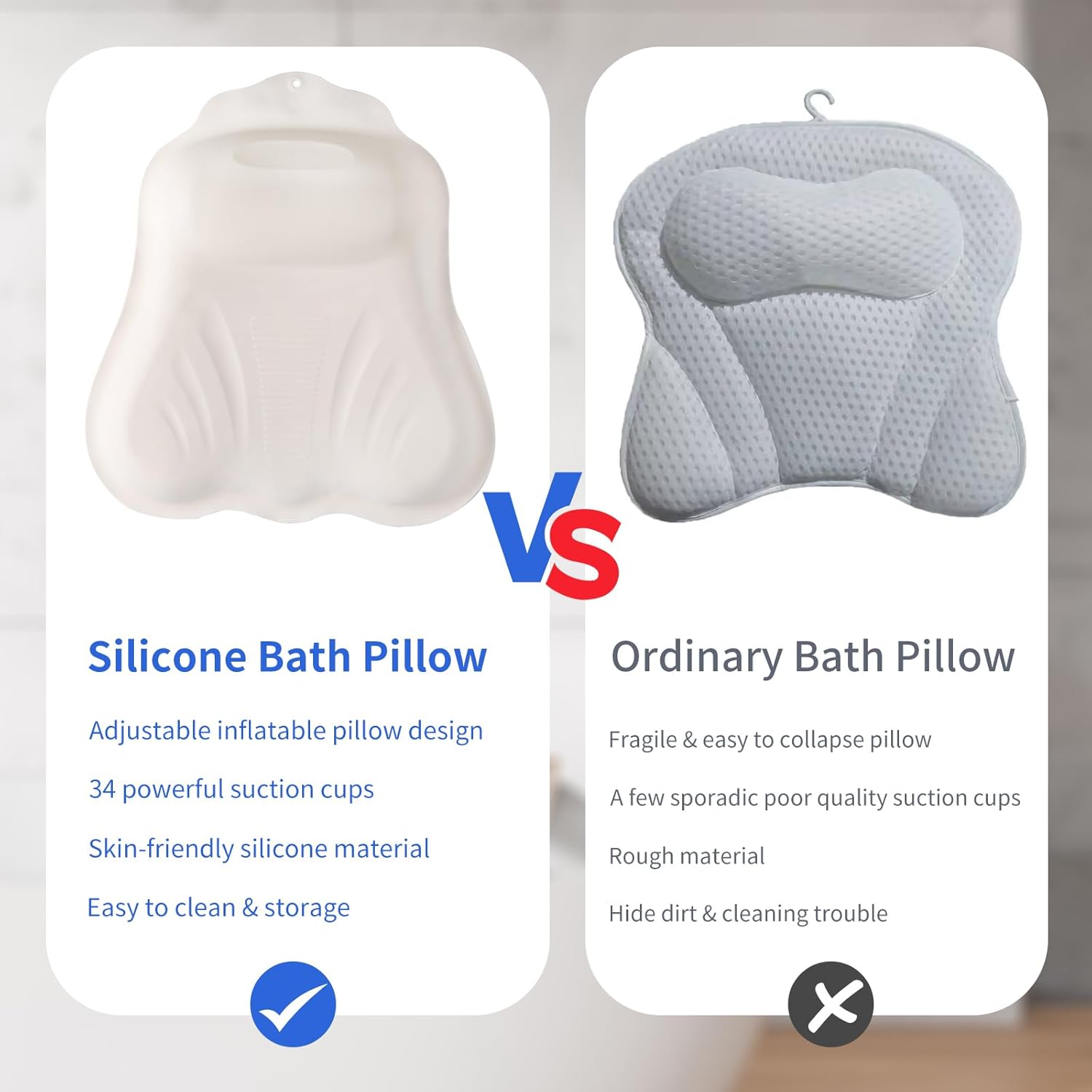 - [SKIN-FRIENDLY SILICONE BATH PILLOW]: The bath pillows for tub is made of upgraded soft skin-friendly silicone material with better elasticity, as delicate as baby's skin, the bathroom pillow better support the head, neck and back, making the bathing experience more comfortable and relaxing.
