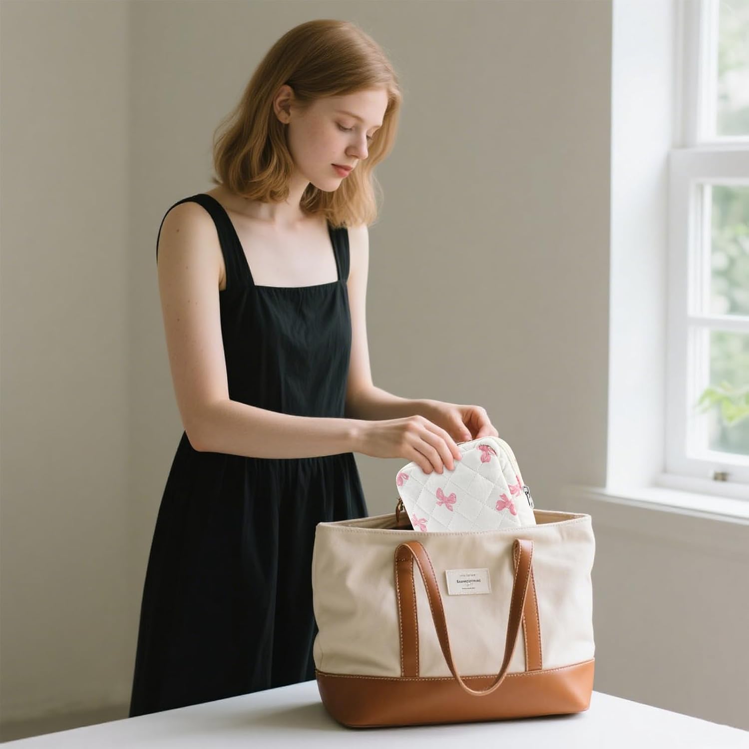 - PORTABLE SMALL BOW BAG FOR WOMEN: Our small cosmetic bag for purse is very light weight, thanks to the use of cotton material and the relatively small size of the mini toiletry bag, our cute small makeup bag are very easy to carry, whether it is a trip or usually go out to shopping, are able to use the make up travel bag organizer to pack the necessities, even if a long time with the side will not feel very tired and troublesome