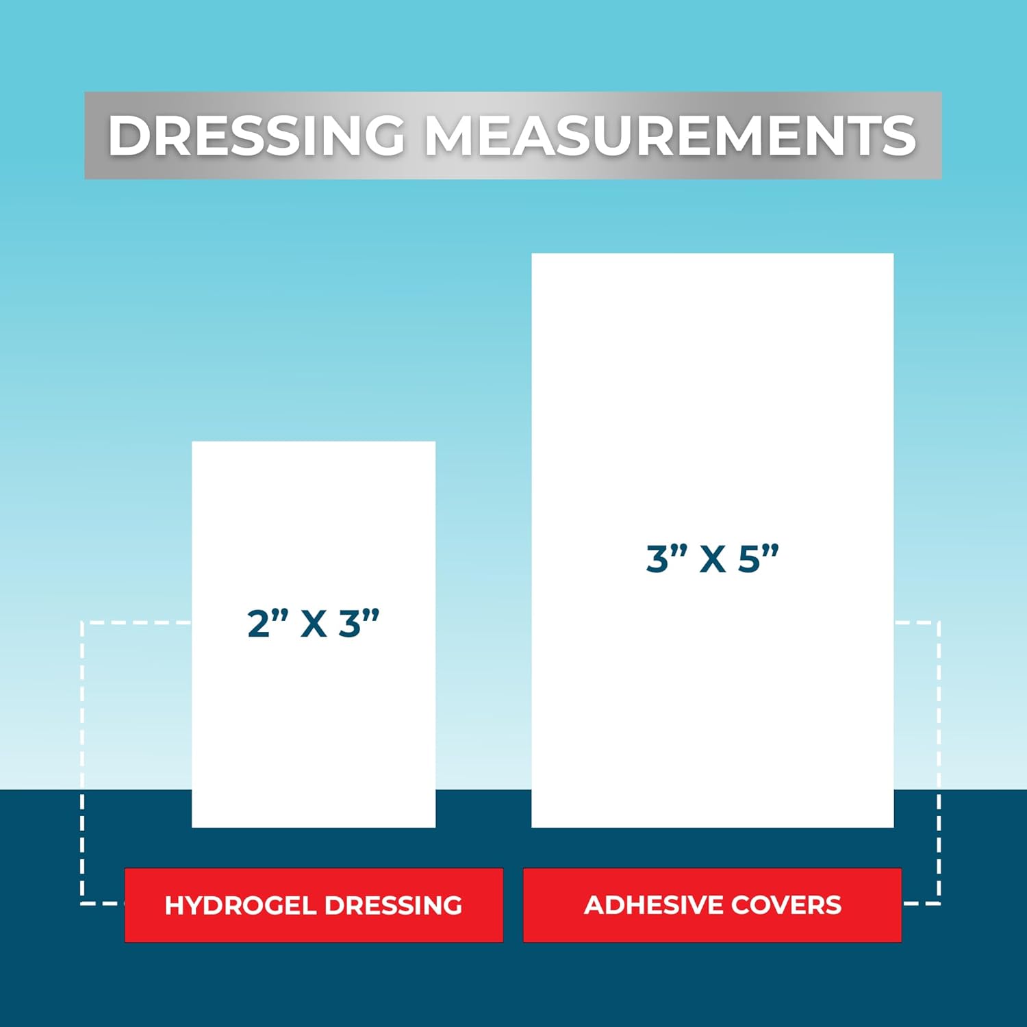 - Made in the USA: This ready-to-use, FDA-cleared kit includes 4 (2” x 3”) single-use hydrogel pads with silver-coated fibers and 4 (3” x 5”) adhesive dressing pads, providing wound protection that stays securely in place for up to 7 days per patch
