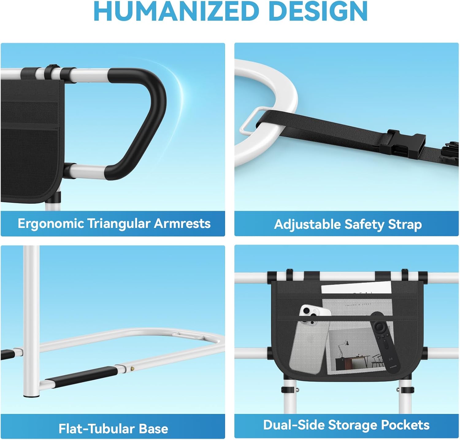 - 🧳 Dual-Sided Storage Pockets 🧳 Removable organizational pouches keep essentials (remotes, glasses, phones, medical essentials, etc.) within reach. Dual-facing design for a more organized life