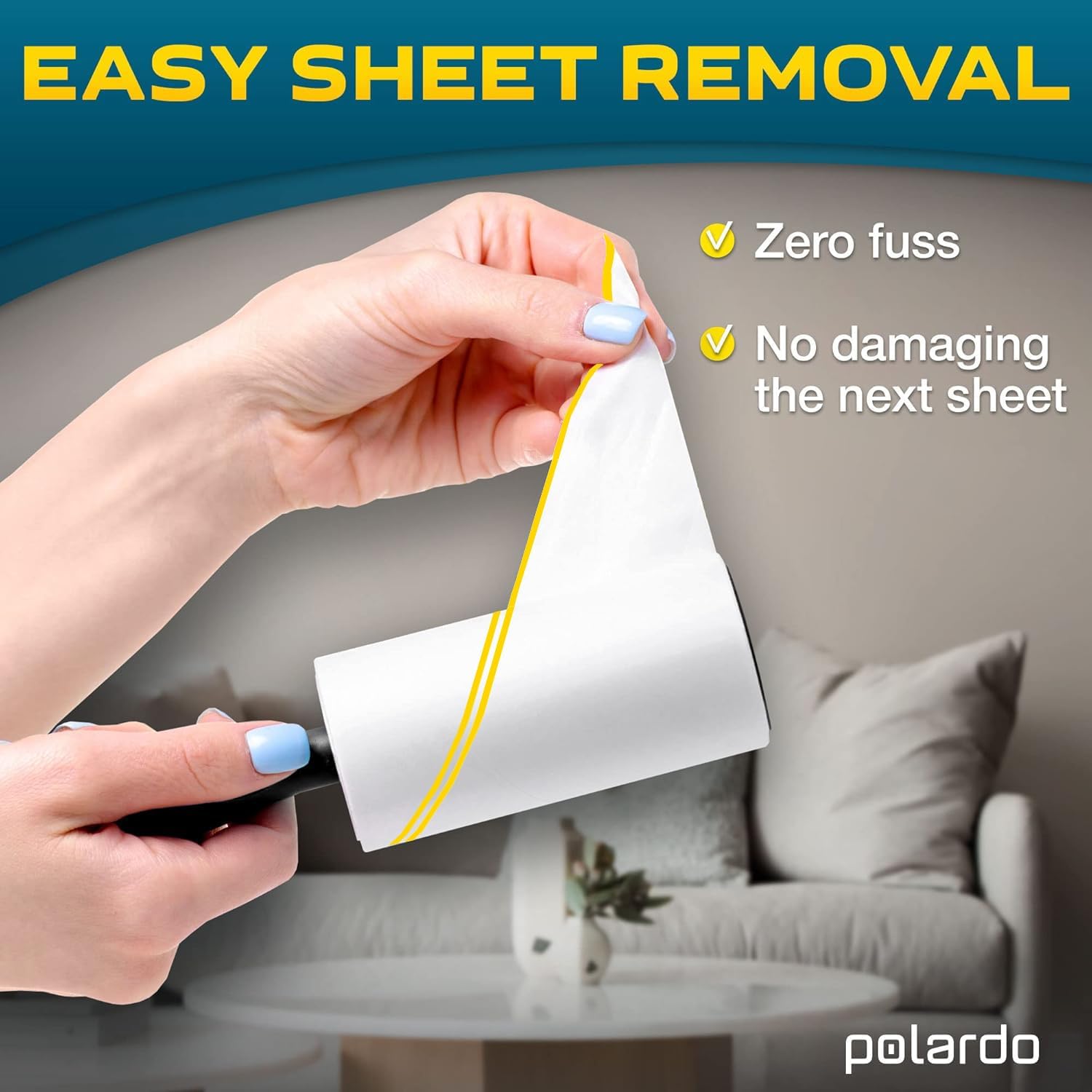 - You get 2 lint rollers and 3 spare rollers, 450 sheets. New model with a printed tear line — for those who find it difficult to locate where to tear off the sheet. Sticky & easy peel off: excellent roller for picking up dust, dirt, lint and removing pet hair. The sticky and easily removable sheets will save you tons of time and energy. Forget about going over the same spot again and again. Instantly pick up dirt and shards even from your most delicate things. Spend no more than a second to effortlessly replace sheets