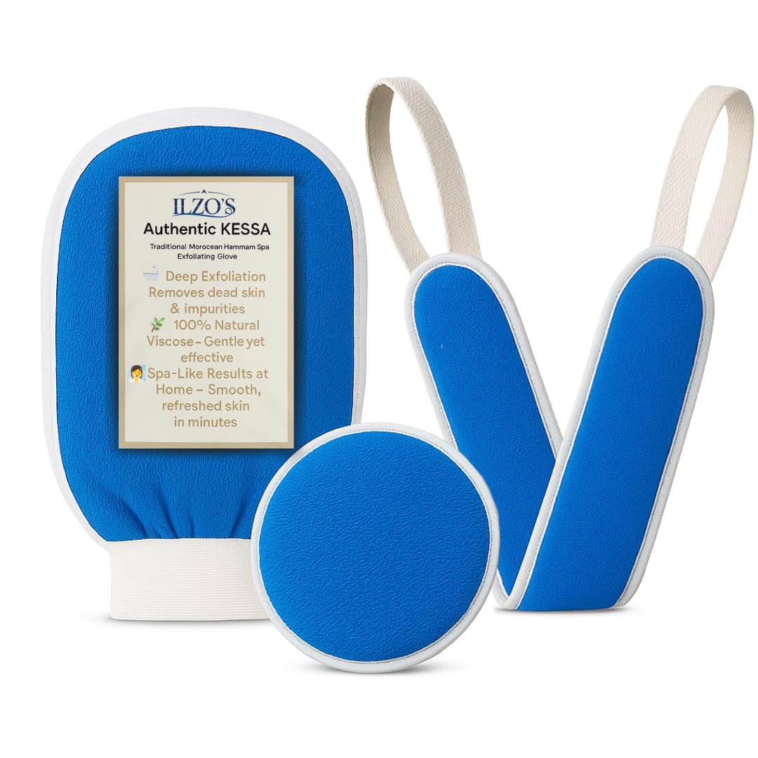 Original Moroccan Kessa Exfoliating Glove Set (ILZO’S) – 3-Piece Hammam Mitts for Face, Body & Back – Deep Skin Cleansing & Dead Skin Removal – Reusable Natural Exfoliator– Assorted Colors (TURQOUISE)