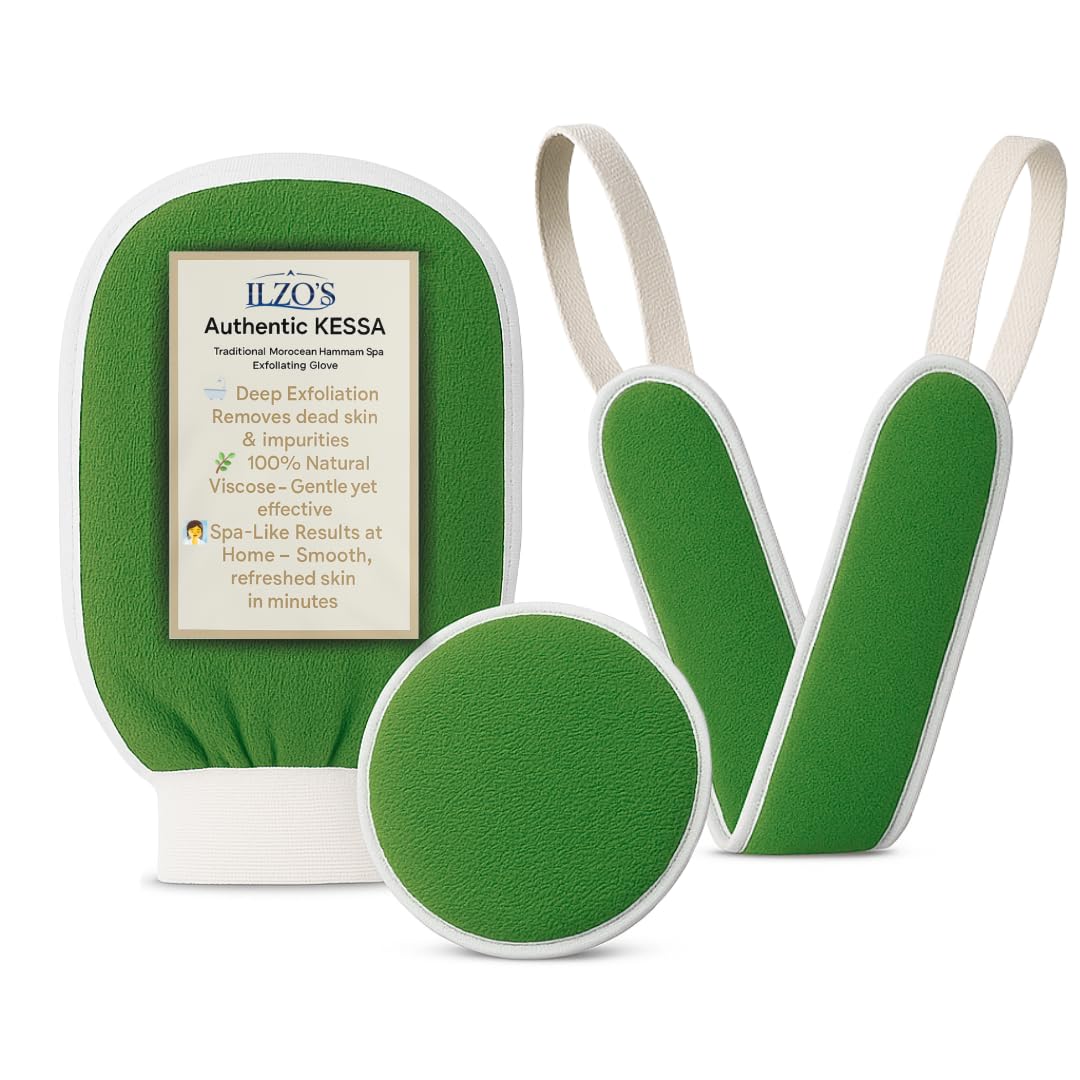Original Moroccan Kessa Exfoliating Glove Set (ILZO’S) – 3-Piece Hammam Mitts for Face, Body & Back – Deep Skin Cleansing & Dead Skin Removal – Reusable Natural Exfoliator – Assorted Colors (GREEN)